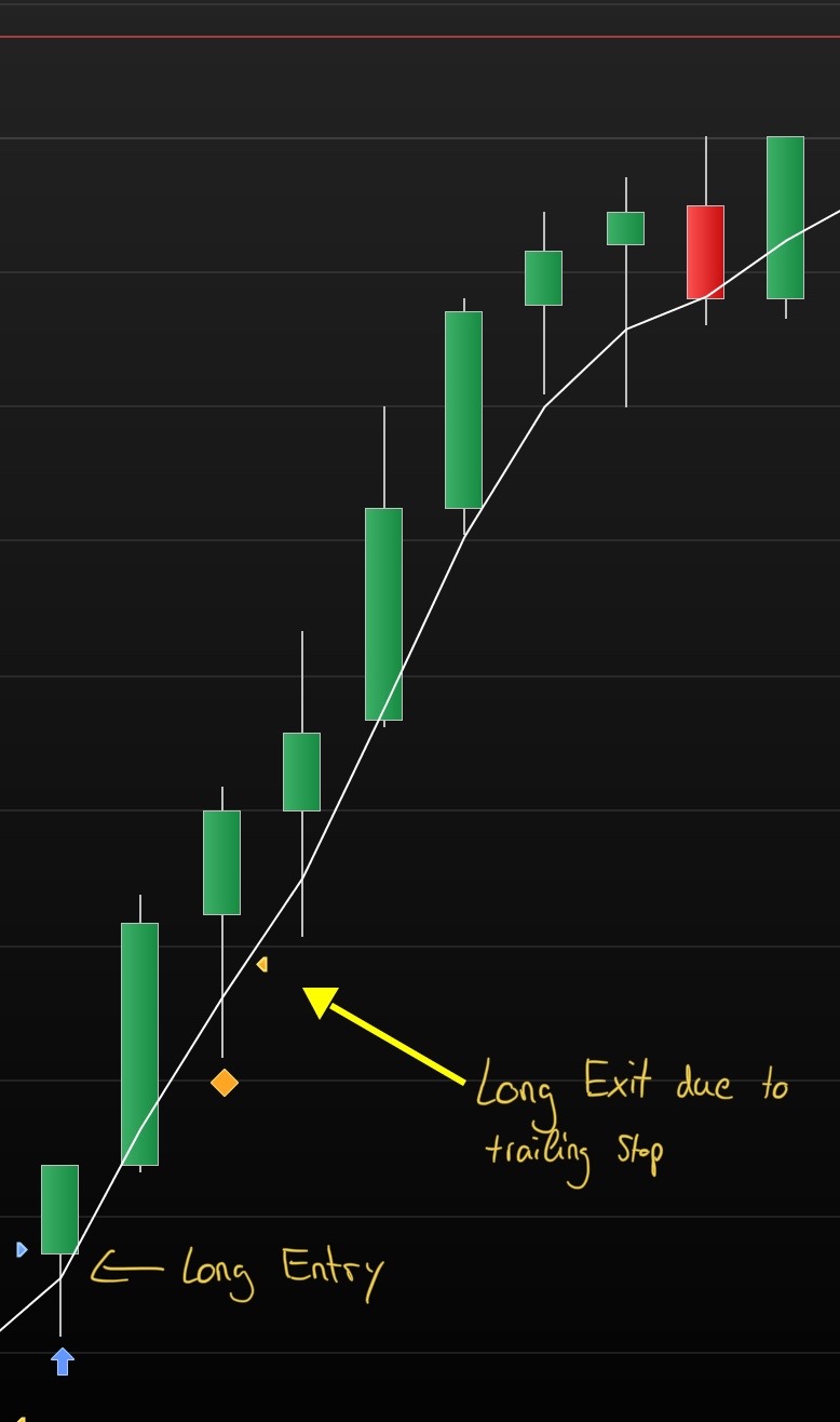 Jedoch soll der TrailingStop nur ausgelöst werden, wenn zusätzlich eine Kerze unter dem EMA 3 schließt.