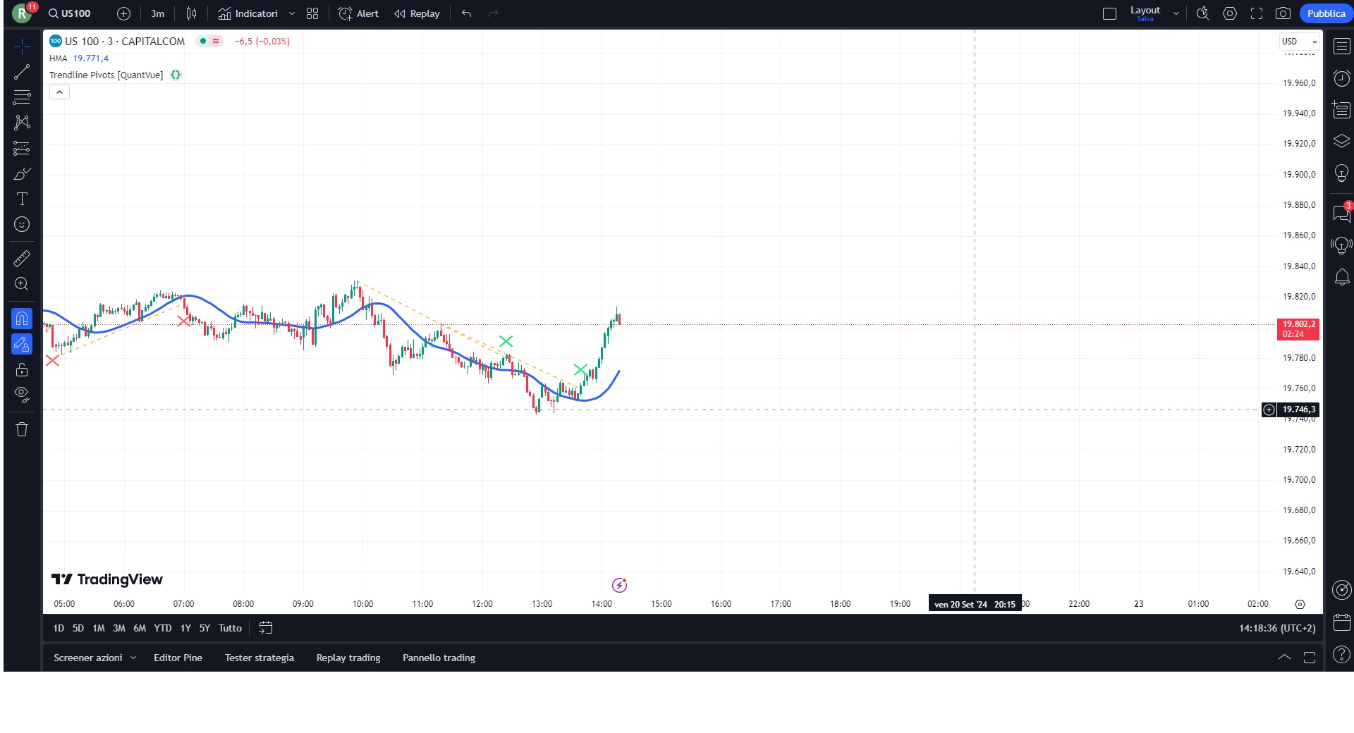 If the price closes(default setting) above a down trend line or below an up trend line, an “x” is displayed, indicating the resistance or support has been broken. At the same time, the trend line transforms into a dashed format, enabling clear differentiation from active non-breached trend lines.