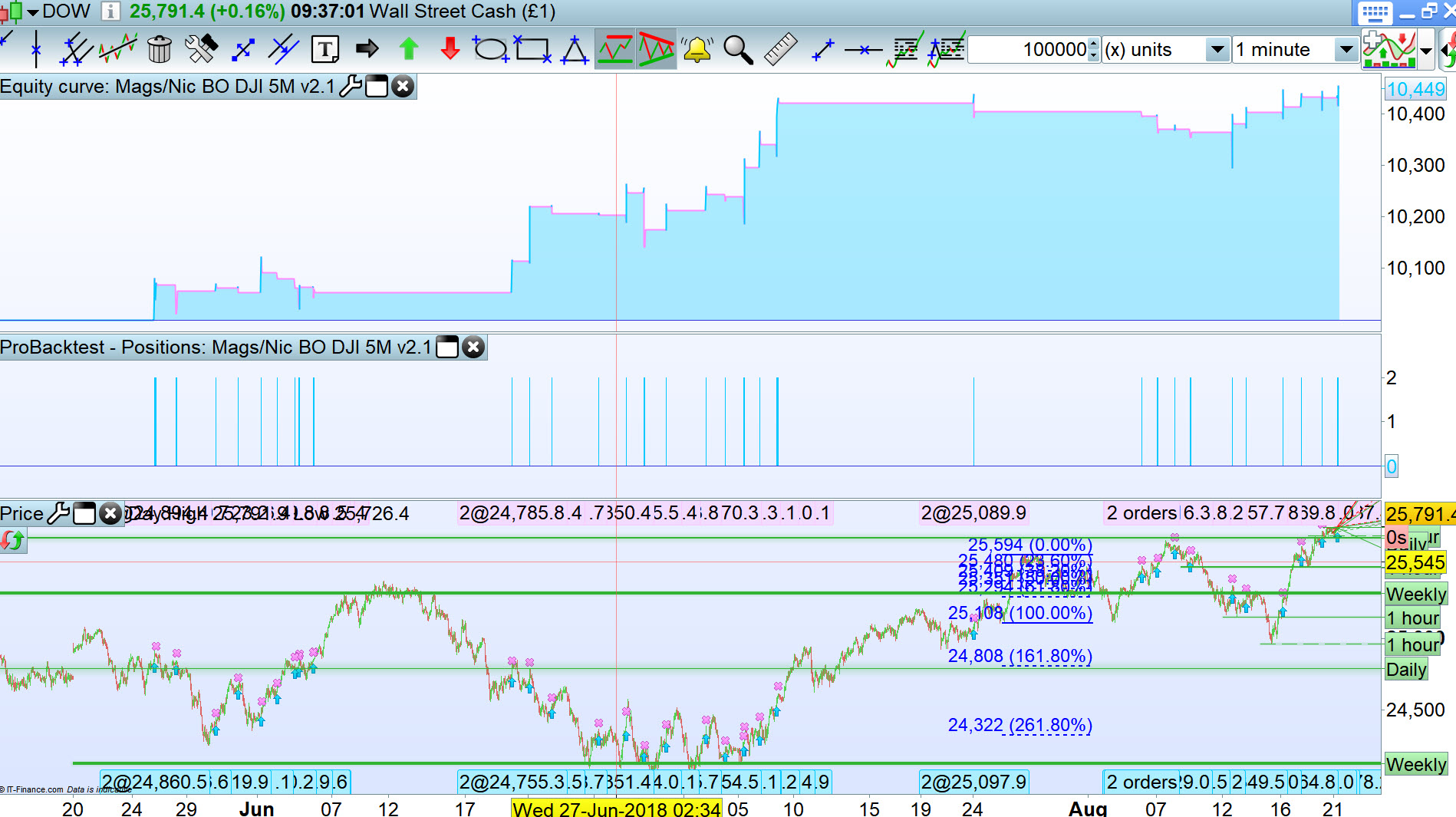 I think that if you are going to use TP and SL levels on an index such as the DJI then it is much better to set them with a percentage rather than a fixed pip amount because as the DJI price increases over time so does the average range of each candle so you are far more likely to stay in tune with the market as it moves forward.