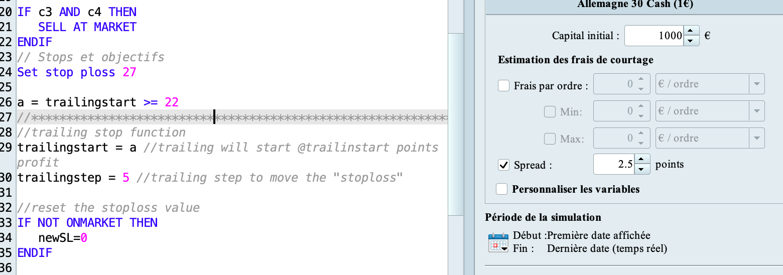 The IG spread is 2.5p on average here so I put it in both backtests, maybe this information could change the variables Nicolas told me to set ? (start : “=>22” and “step : 5”) ?