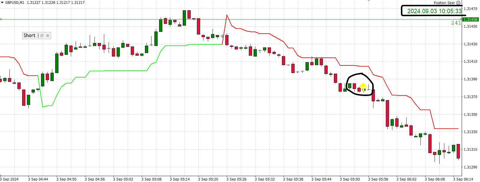 Segnale di vendita: Se il SuperTrend è ribassista e il Williams %R in M5 è in ipercomprato, mentre quello in M1 è sotto il livello medio, si attiva lo stato di “checkingshort”. Successivamente, se il SuperTrend passa da ribassista a rialzista o il Williams %R in M1 supera il livello di ipercomprato, viene disegnata una freccia di vendita (arancione).
