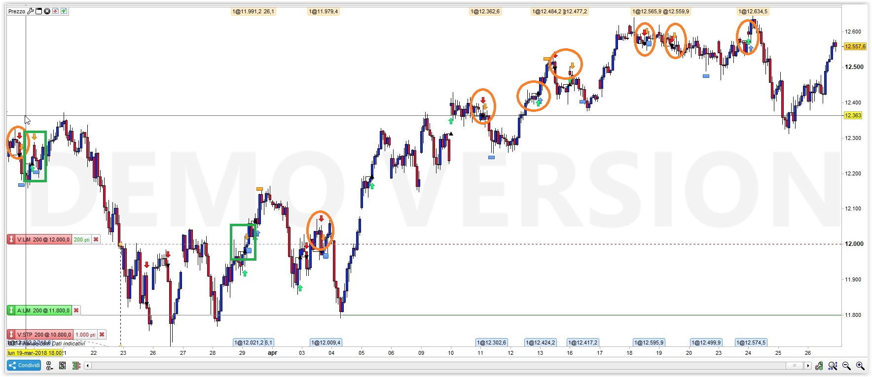 Il segnale da te cerchiato in rosso nell’immagine 10 l’ha eseguito, non vedi, alle 14:10 (la candela doji) perché solo allora il prezzo ha toccato quello indicato dal segnale (12765.30).