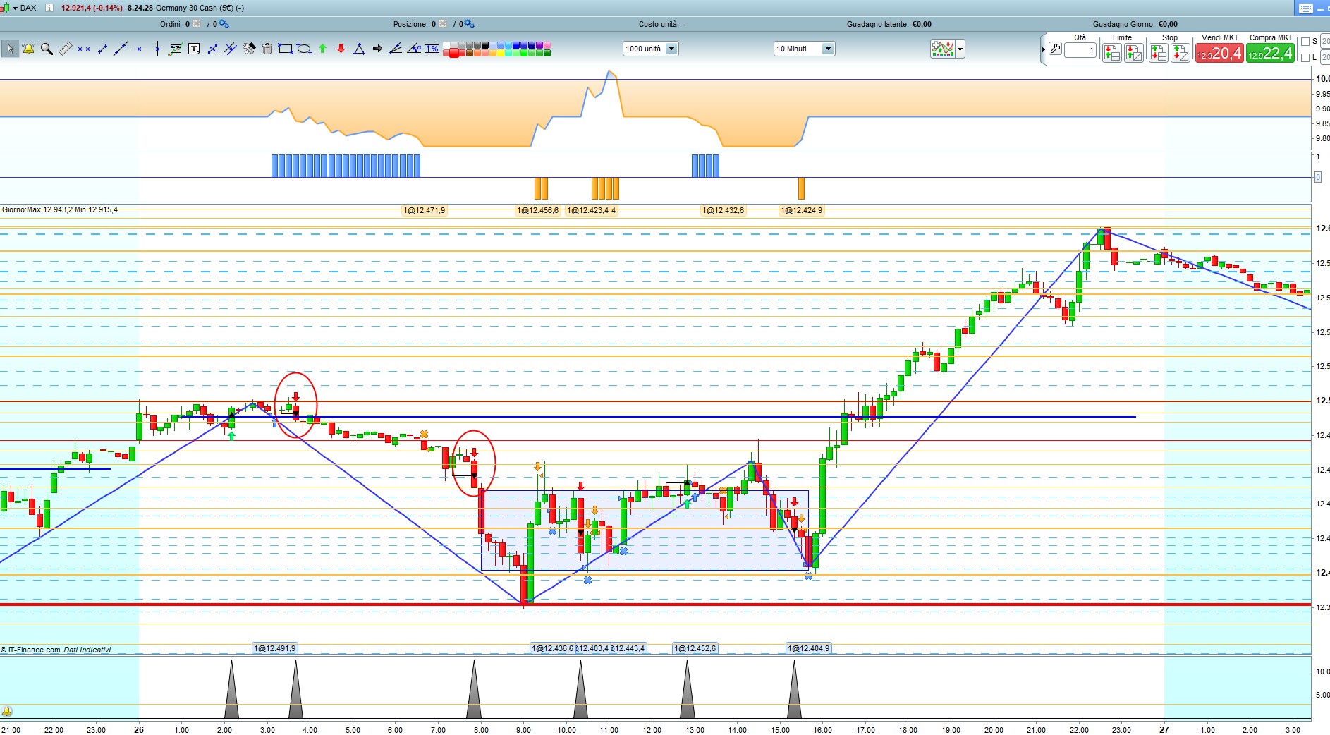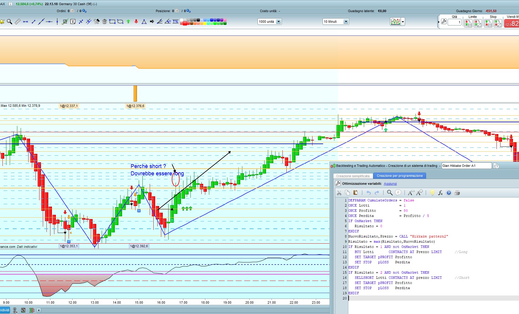 Dalla foto che allego, DAX h1, vedo che fa sia Long che Short (evidenziati con un’ellisse arancio). Però fa anche cose strane che ho evidenziato con un rettangolo verde, che non sono riuscito a capire bene.
