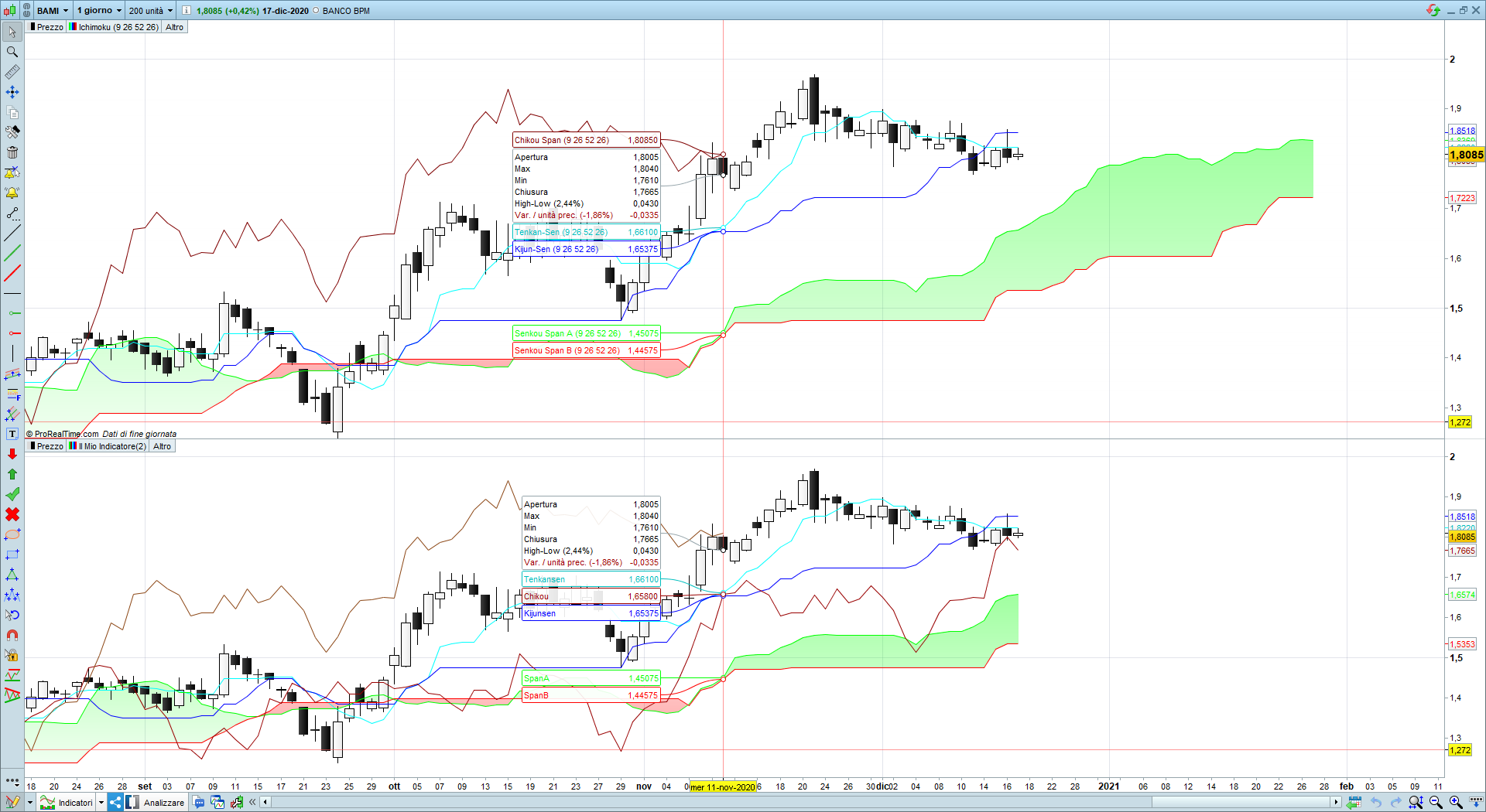 Ringrazio per la risposta ma ribadisco il concetto. La Chikou Span è il prezzo di adesso spostato indietro di 26 periodi. Se guardi ad esempio il titolo BAMI, grafico giornaliero su PRT con Ichimoku settaggio standard, la chiusura di ieri 15 dicembre è a 1,8170, la Chikou Span quota anche lei 1,8170 esattamente come la chiusura di ieri (e non come la chiusura di 26 giorni prima) ed è solo spostata indietro di 26 periodi, nella rappresentazione grafica la si vede sopra alla candela giornaliera del 09 novembre, tale candela ha una chiusura di 1,7675 (chiusura di 26 periodi fà) e nella Chikou Spam il valore di 1,7675 lo ritrovi 26 periodi prima del 09 novembre cioè in relazione con il giorno 02 ottobre. Se su PRT provi a modificare su impostazioni indicatore – spostamento orizzontale – usa uno spostamento personalizzato e ad esempio metti 5 periodi (anzichè i 26 del settaggio standard), il valore della Chikou Span di ieri 15 dicembre a 1,8170 si sposta 5 giorni prima ovvero in corrispondenza del 08 dicembre quando il titolo ha chiuso a 1,8280. In pratica: su PRT l’Ichimoku correttamente prende l’ultima chiusura e la trasla semplicemente indietro del periodo che si desidera.