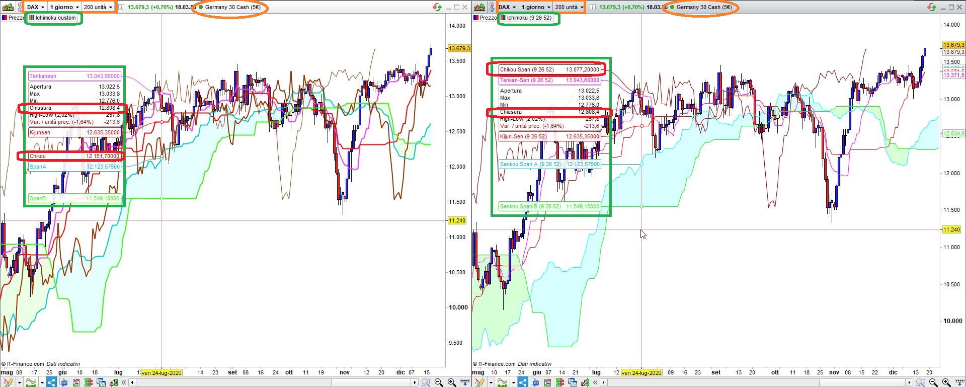 Ti allego uno screenshot di due grafici identici in parallelo (Dax 5€, Daily) con Ichimoku settanto in modo standard in entrambi i casi, come vedi dai valori riportati dal cursore, sono assolutamente identici, l’unica differenza è nello Chikou: