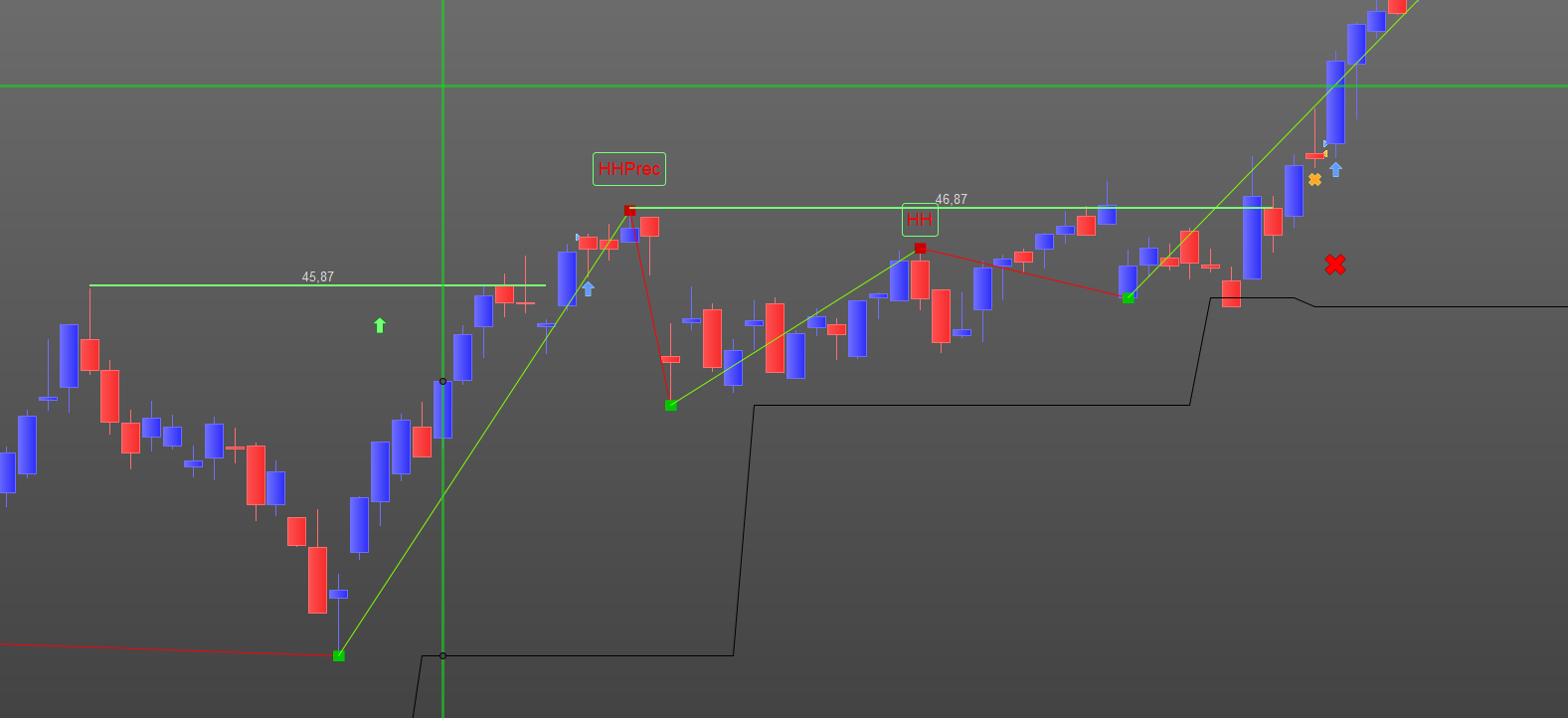 Ich habe ein Foto in die Anlage gemacht, dass zeigt, dass das Trendfolgesystem mit dem Indikator oft oft gleich nach einem Ausstieg einen neuen Trade eröffnet, obwohl kein wirkliches Signal vor liegt?? Das verstehe ich nicht?? Es steht ja imcode beschrieben dass das HH > sein soll als das HHPrec