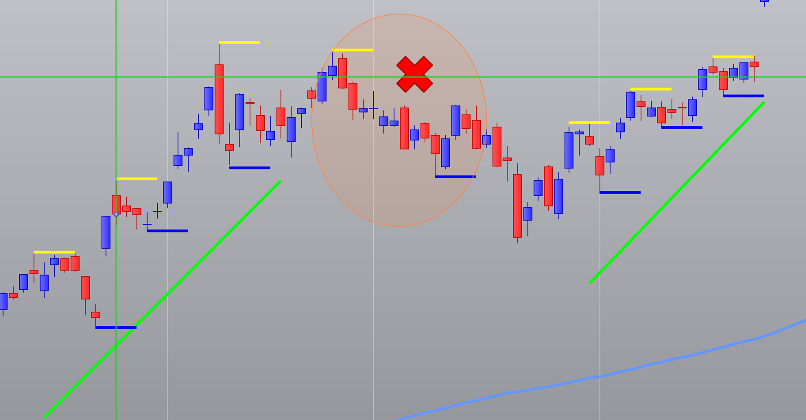 Wie im Bild zu sehen, sollen auf einem Hoch und Tief Linien enstehen. Eine gelbe Linie steht für ein Higher High, beginnt auf dem Hoch der Kerze, nach der an 3 aufeinander folgenden Tagen kein neues Hoch ensteht. Bei den Tiefs, mit blauen Linien markiert, ist es genau anders herum.Die Linien sollen über die folgenden 3 Kerzen lang sein!