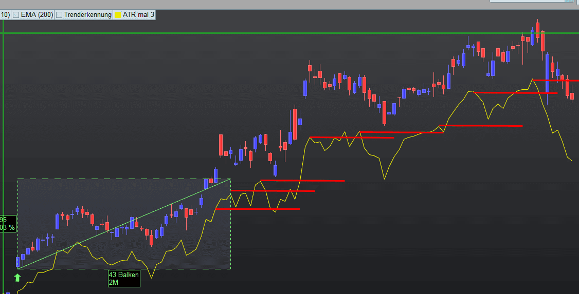 Wenn der Kurs der Aktie 30 % gestiegen ist, dann soll der ART (14) * 3 (close – averagetruerange[14](close)*3) der Trailingstop sein und mit dem Kurs mitgehen, wie die roten Linien kennzeichnen. Der Stop loss geht nicht mehr runter!!