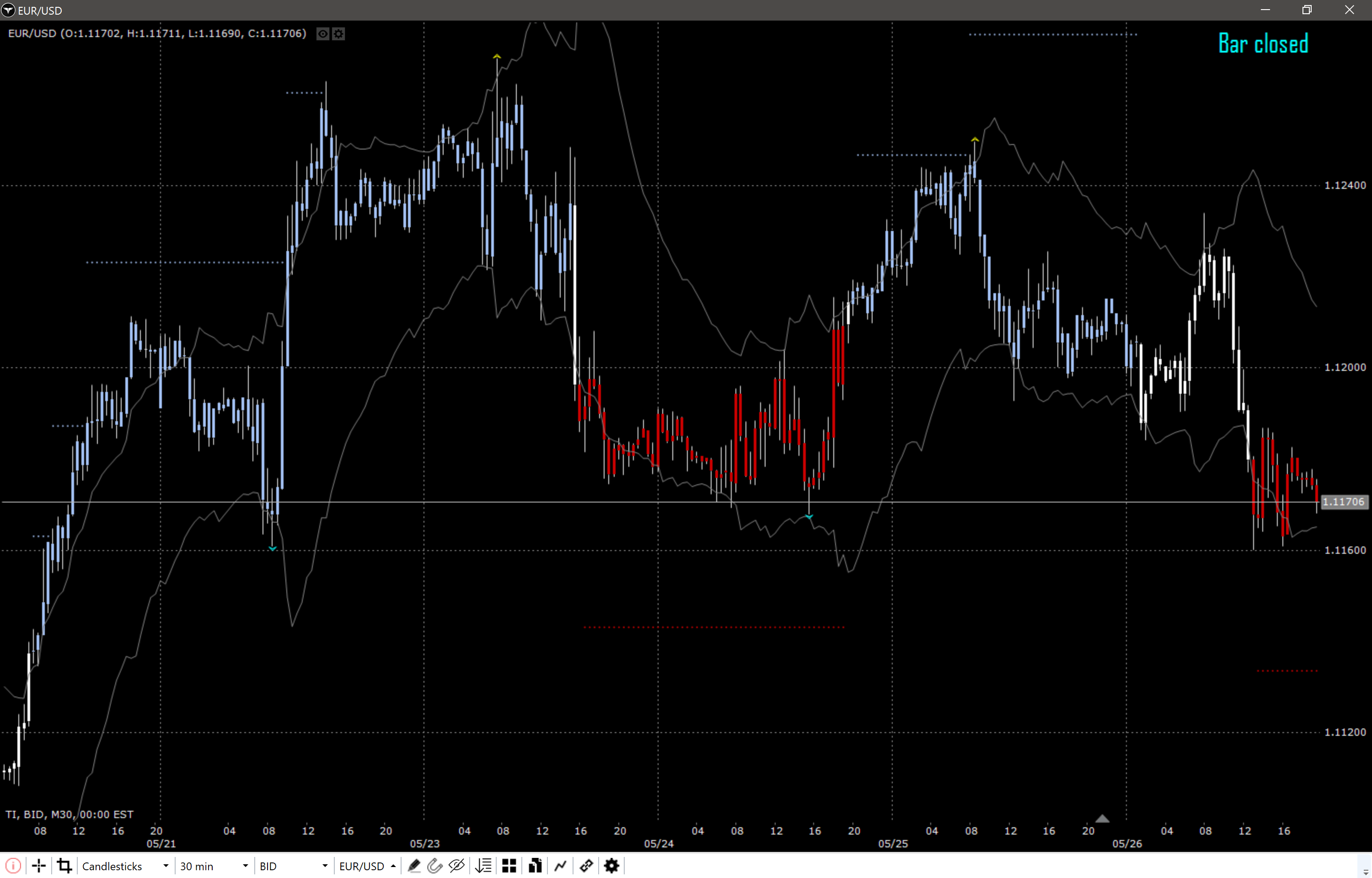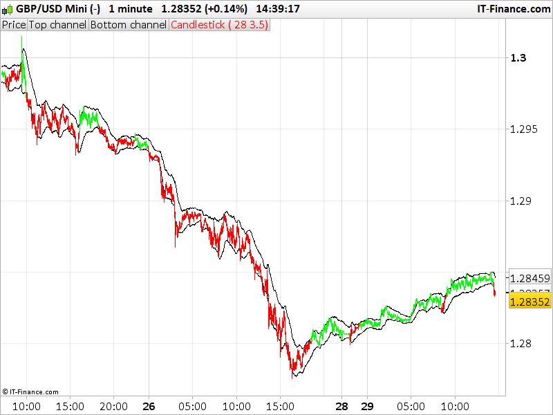 Ce que je cherche a obtenir c’est colorer les candles tant que le scenario inverse n’est pas realise. Pas juste dessus dessous… Dans l’exemple, admettons que l’instrument passe au dessus de la bande sup, scenario haussier > candle verte par exemple, reste verte lorsque le prix re-penetre a l’interieur du channel, et ne change de couleur qu’apres avoir crossed under la bande inferieure.