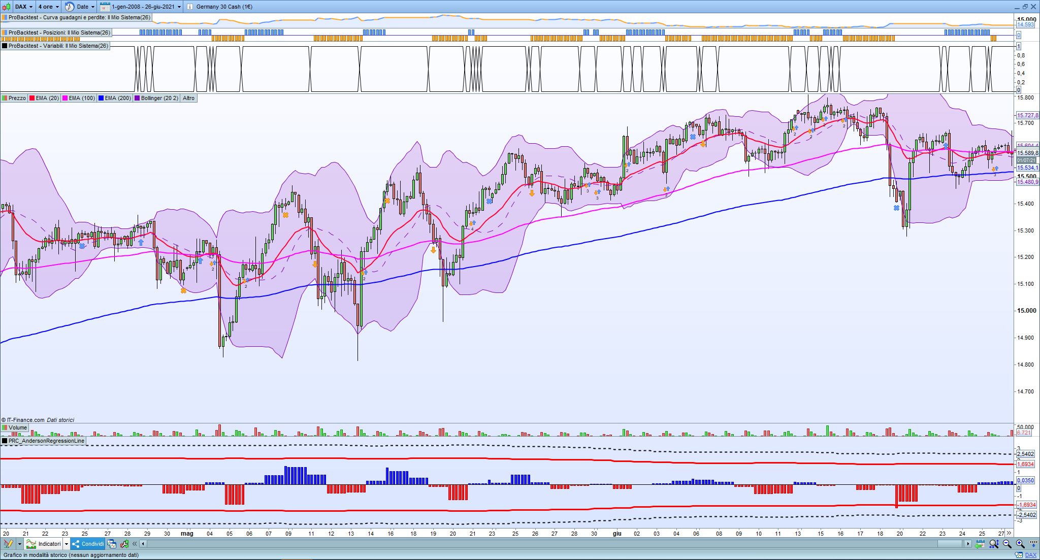vedrai, nel riquadro delle variabili che ProBackTest aprirà (sotto la curva dell’equity), i valori che C ha di volta in volta e ti renderai conto cher quando incrociano c’è stato un cambio ed entra (la freccia la vedrai sulla candela successiva).