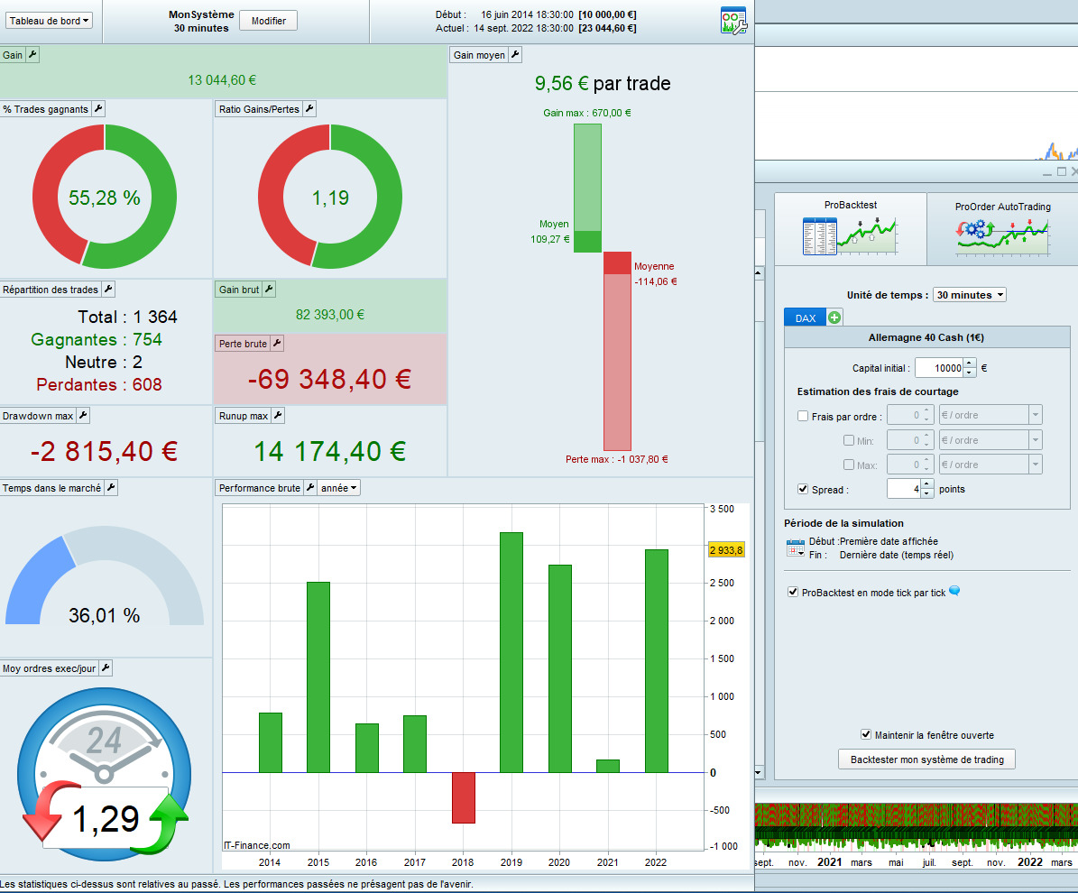 Posto questo T.S. che lavora sul Dax sfruttando la tendenza rialzista dopo la chiusura del mercato. Il sistema lavora su più timeframe ed è stato ottimizzato escludendo alcuni giorni del mese che statisticamente hanno una tendenza opposta. Il backtest è su timeframe a 30min ma dovrebbe poi girare su TF 5minuti per la miglior gestione del trailing stop.