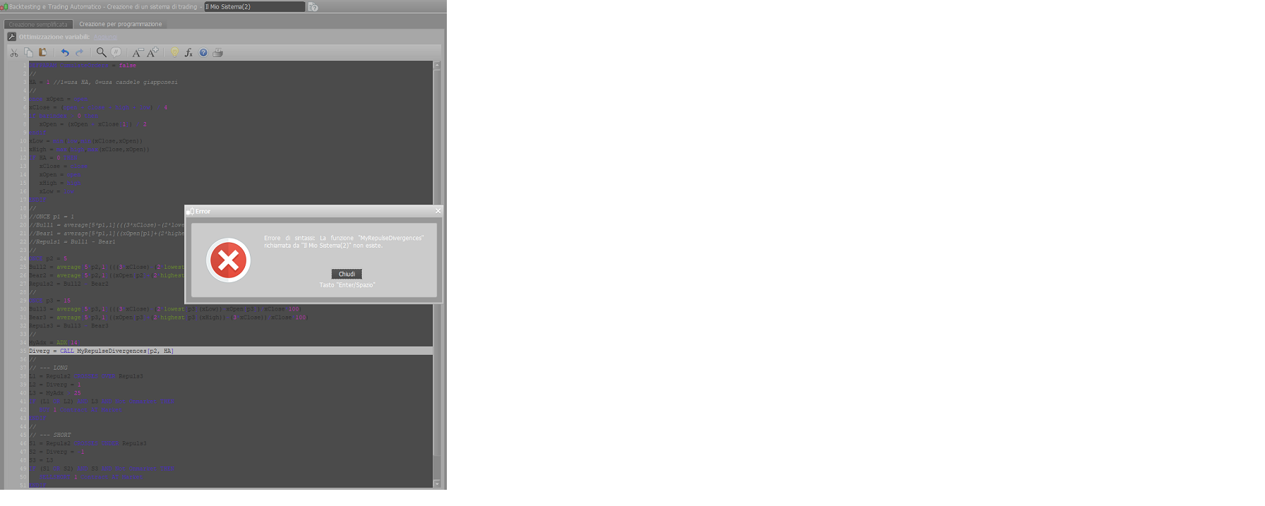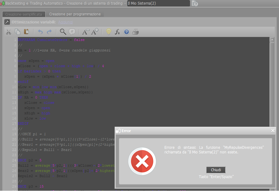 Ti allego l’indicatore MyRepulseDivergences che richiede due segnali (Periodi e Tipo di Candele: 0=regolari, 1=HA) e restituisce 0 (nessuna divergenza, 1=divergenza rislzista, -1=divergenza ribassista). Questo indicatore derova da un altro esistente nella libreria e predisposto originariamente per il Macd (nel file c’è il link di riferimento).