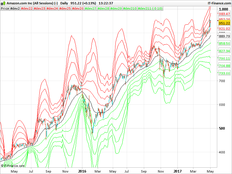 Il rigo 1 definisce la media mobile di periodo 40, assegnandola alla variabile x1. Il rigo 2 calcola il valore di una singola deviazione standard sulla base di una media mobile di periodo 40, assegnandola alla variabile x2. Il rigo 3 consente di visualizzare la prima linea del tessuto partendo dall’alto; è una misura pari a 5 deviazioni standard al di sopra della media mobile di periodo 40. I righi da 4 a 7 fanno la stessa cosa con quantità diverse di deviazioni standard. Il rigo 8 traccia la media mobile esponenziale di periodo 40, mentre i righi dal 9 al 13 tracciano le linee del tessuto al di sotto della media mobile. Ecco il codice in linguaggio per MetaStock, qualcuno potrebbe tradurlo per la piattaforma PRT:
