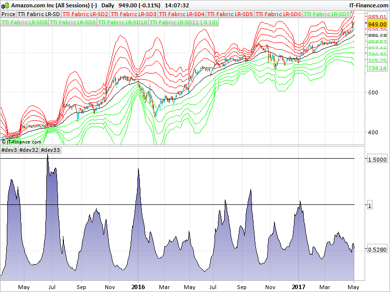 Questo indicatore evidenzia il tessuto della volatilità formato da deviazioni standard consistente in una variazione delle bande di bollinger.