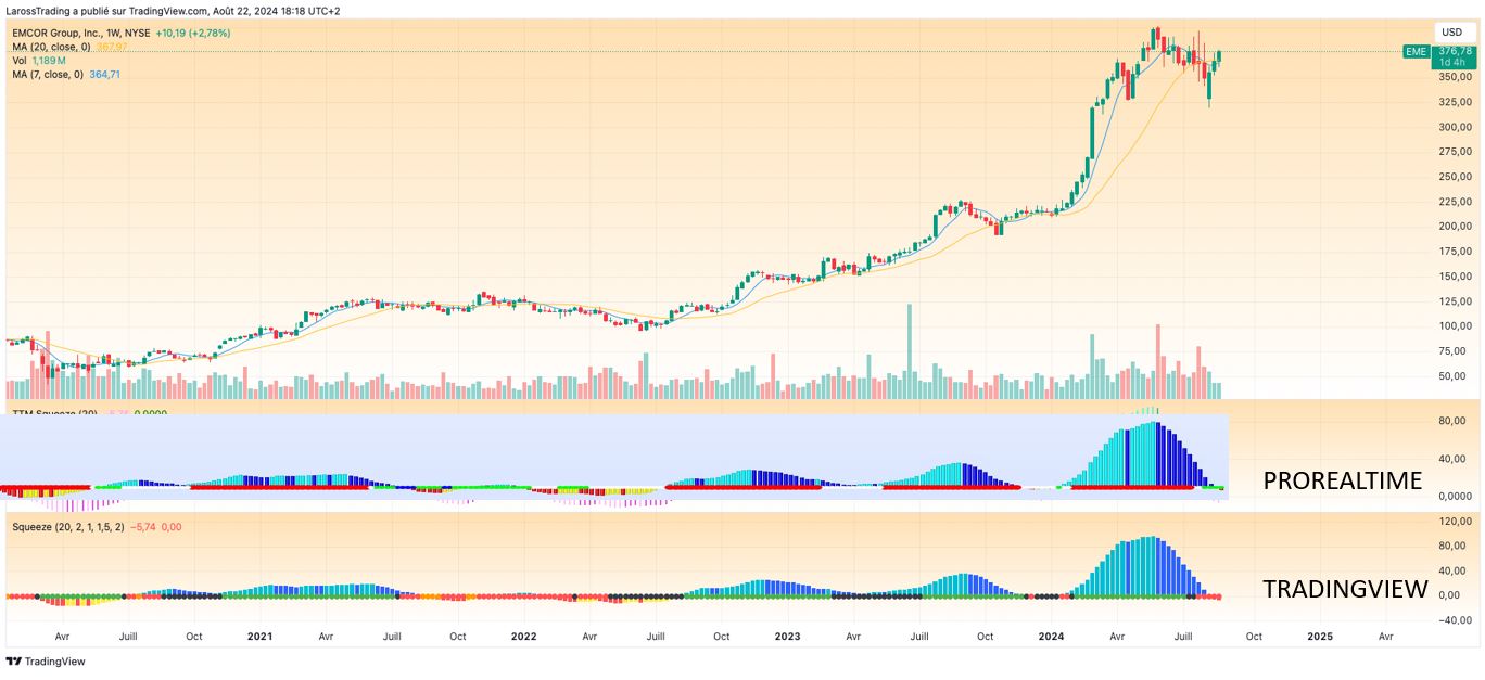 Alfy avait mis à disposition sur ce site le programme. J’ai récupéré cette semaine la version Trading View et il y a des écarts que je ne m’explique pas entre les deux programmes. En fichier joint un photomontage pour montrer les écarts entre les deux indicateurs (les codes couleurs sont différents concernant les phases de squeeze (ligne de points à 0)). L’indicateur momentum est bon, seul les points pour Trading View (noirs, oranges, rouges) et Prorealtime (blancs, verts,rouges) diffèrent sur leur période et leur nombre.