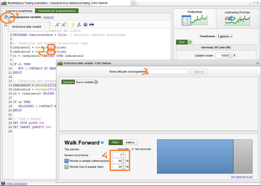 Per fare le ottimizzazioni con il codice creato tramite la programmazione assistita (o facilitata) devi innanzitutto cliccare sul simbolo del LUCCHETTO per abilitare le modifiche, dopodiché segui i 4 passi indicati nella foto allegata ed inserisci le variabili da ottimizzare (dovrai prima avere sostituito i valori scritti in rosa con le variabili da ottimizzare).