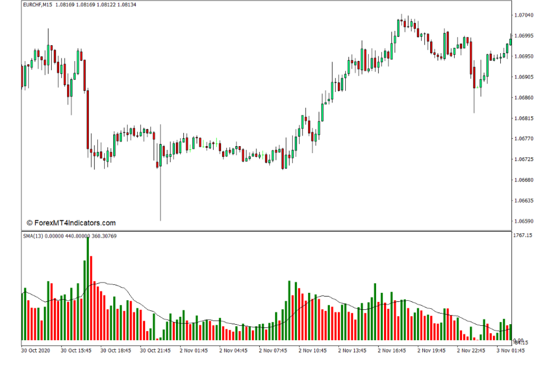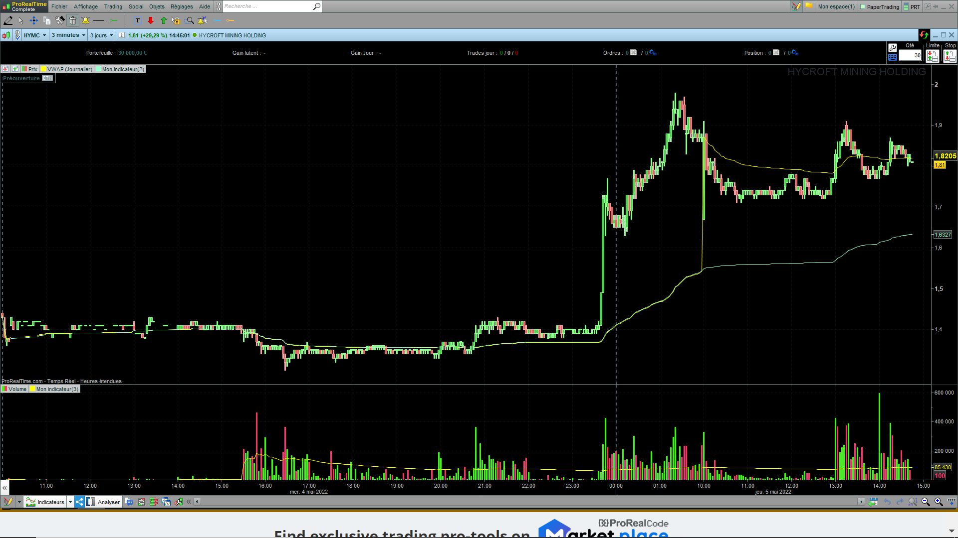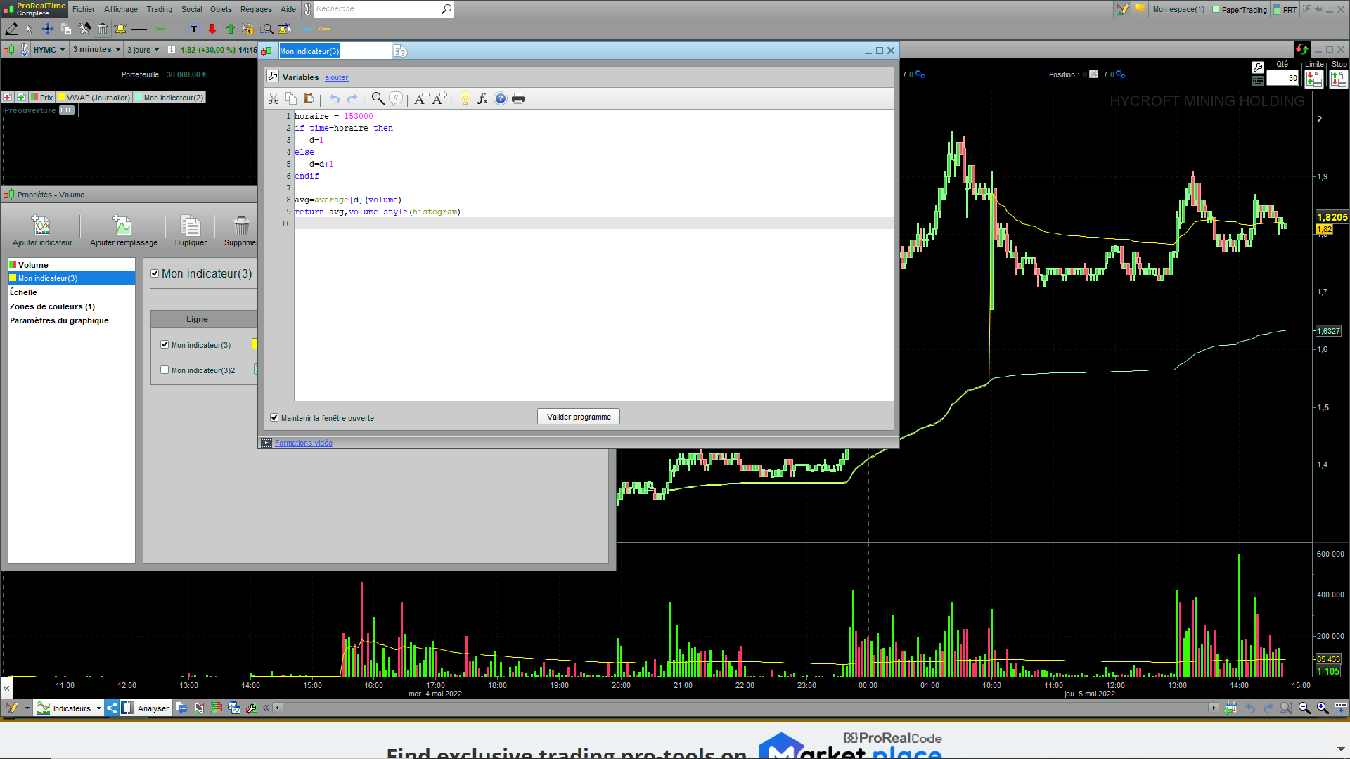 Mon indicateur doit représenter un volume moyen pondéré par le temps, que je voudrais afficher dans l’encadré du volume.