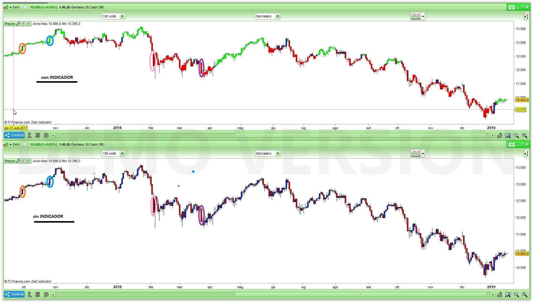 El primero es para dibujar las velas en verde por encima de la media y en rojo por debajo.