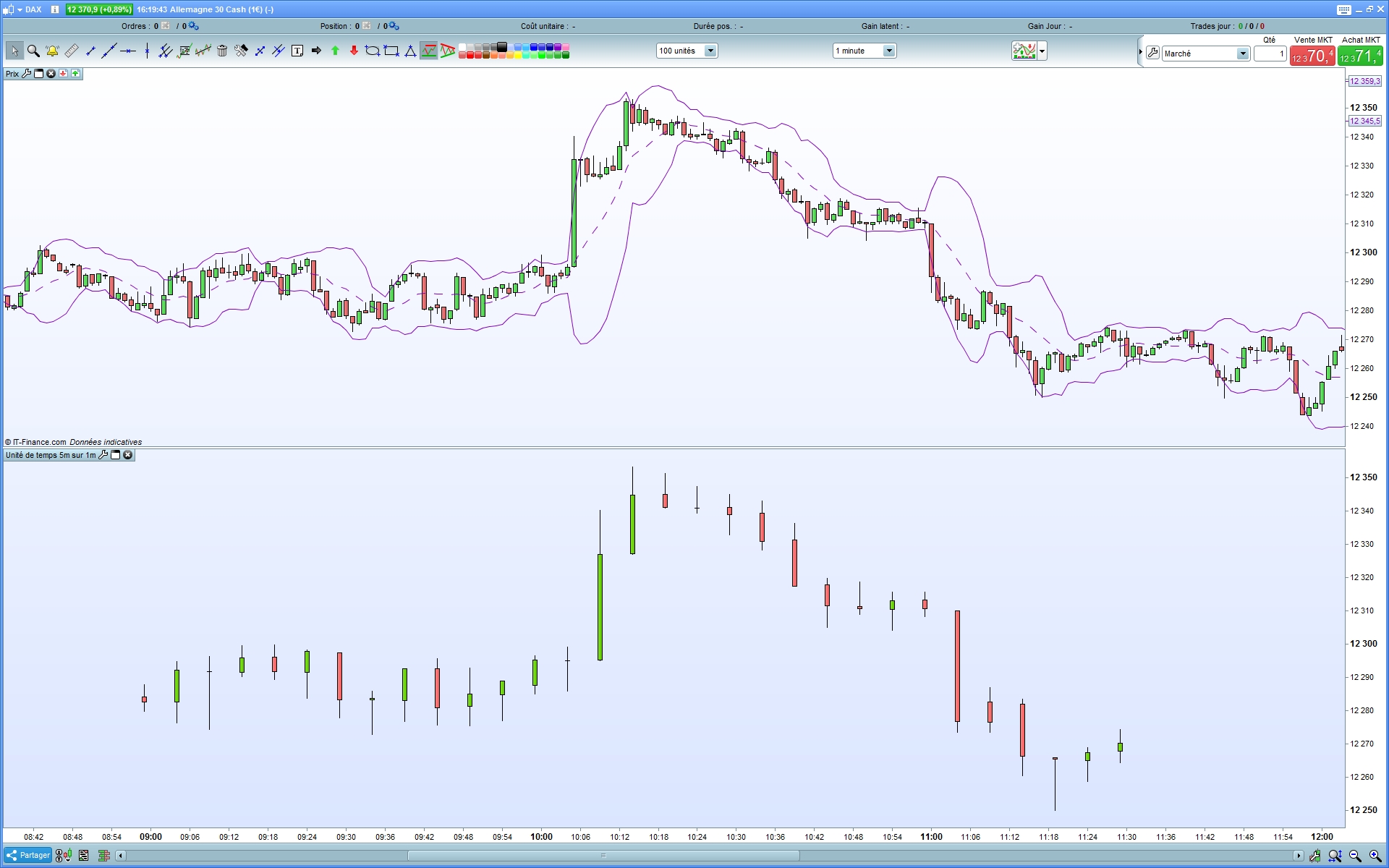 J’ai créé un indicateur qui affiche l’unité de temps 5 minutes sur le graphique 1 minute. Pour l’instant, je l’ai rédigé de 9H00 à 11H30.