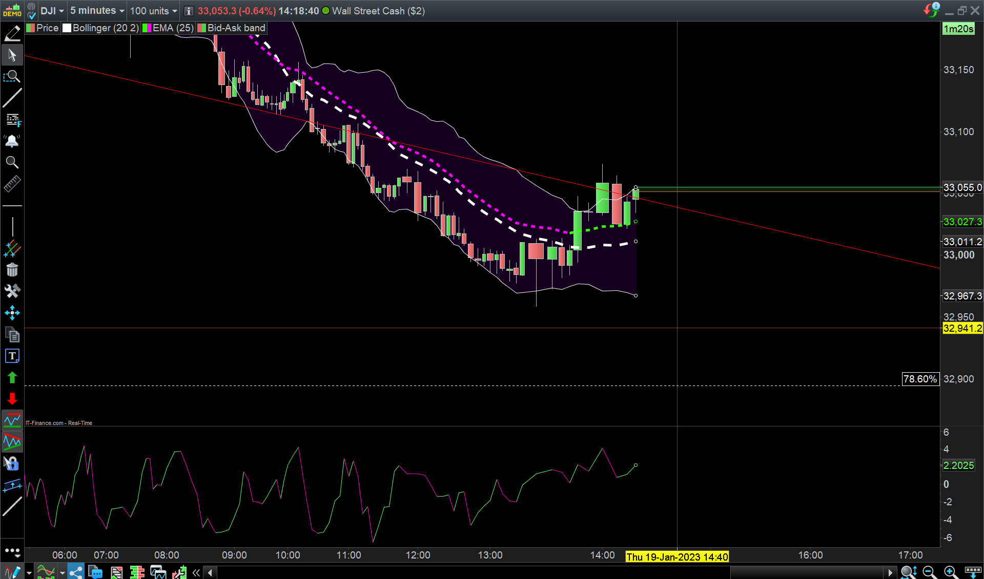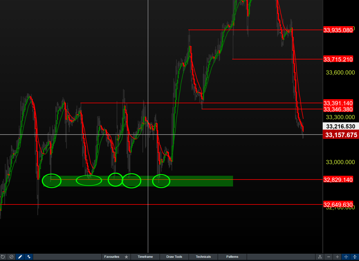 The 1 hour chart looks like a strong up move with momentum but it has resistance if you look to the left of the screen. It it breaks that resistance and it becomes support next stopping point should be 33715 the downside move could bounce at the support at 32840