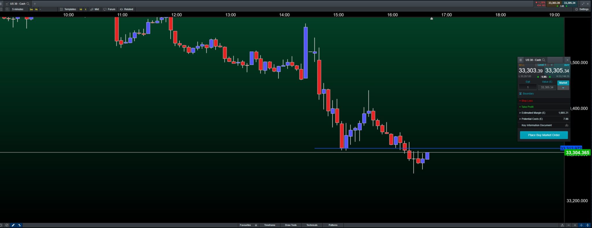 For the Dow Jones, that amounts to a margin of: 5% * 33,300 = 1665 euros