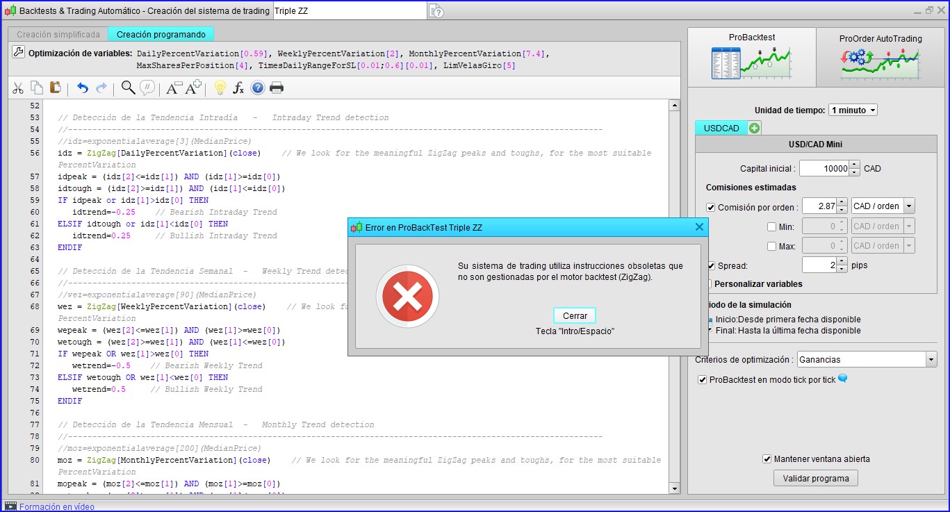 Estoy tratando de compilar el backtest de una estrategia basada en la instrucción “ZigZag”. Sin embargo, cuando intento validar el código del backtest, me aparece en pantalla el mensaje “Su sistema de trading utiliza instrucciones obsoletas que no son gestionadas por el motor backtest (ZigZag)”. Adjunto una captura de pantalla.