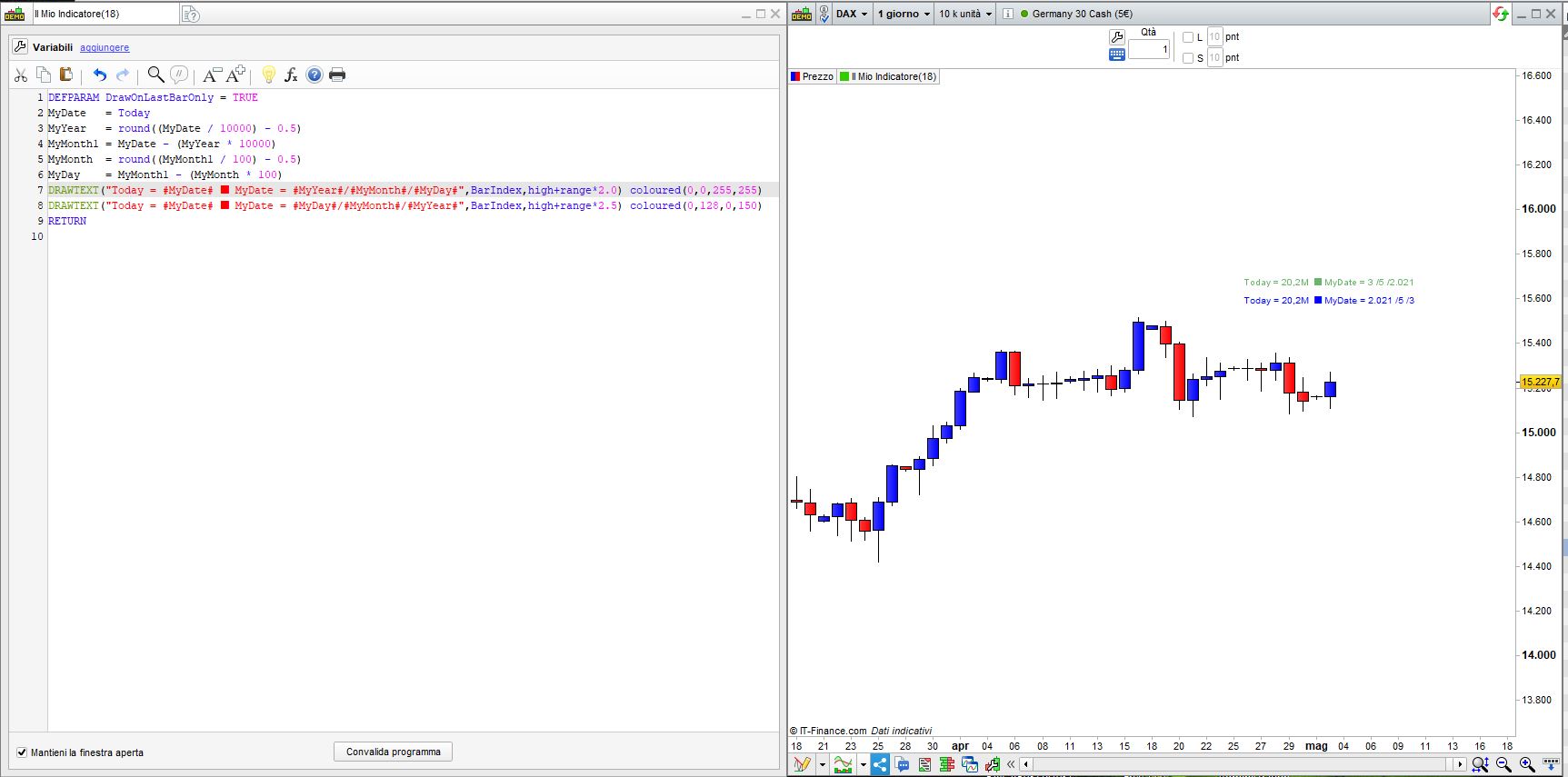 Per capire come gestisce le date PRT ho provato ad inserire il seguente codice per visualizzare la data di oggi vicino all’ultima candela:
