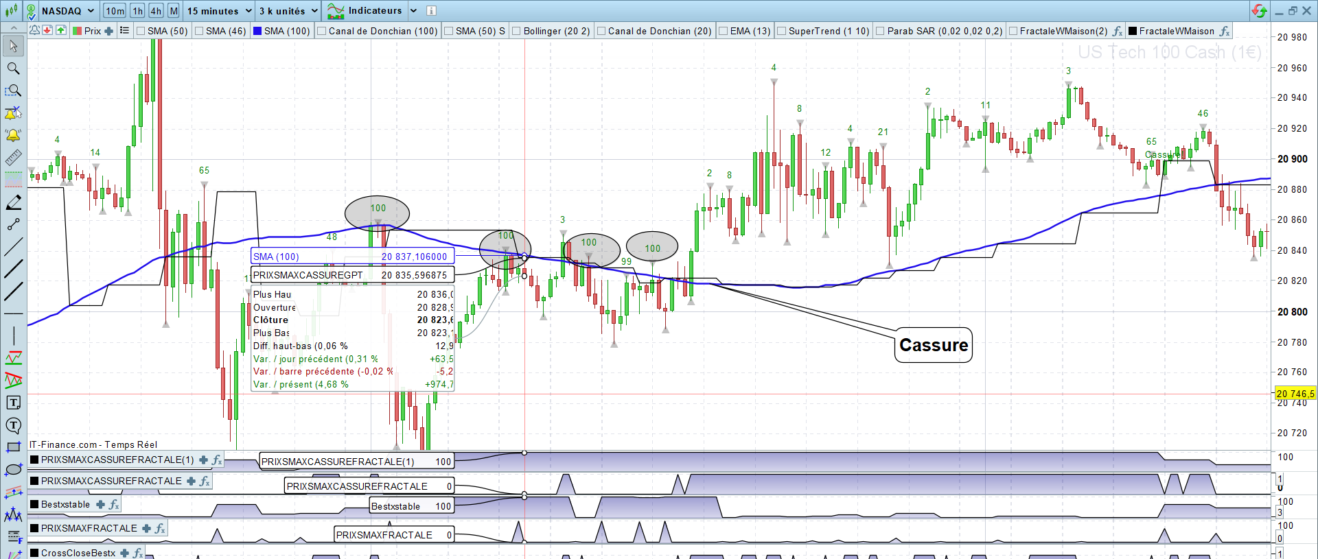 Je souhaite utiliser une période dynamique pour calculer une moyenne mobile simple (SMA) dans ProRealTime. L’idée est que la période de la SMA soit basée sur une variable calculée dynamiquement, appelée BestX. Cette variable est obtenue à partir d’une logique précise qui détecte les niveaux pertinents sur le graphique.