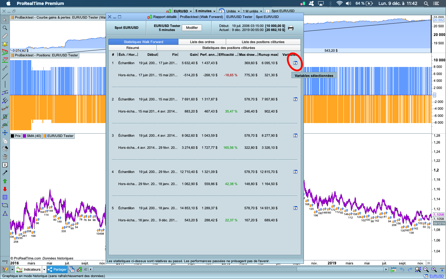 Mes images illustrent mes propos ; si vous faites un backtest sur code en ajoutant une variable d’optimisation et que vous activez le Walk Forward (chiffres 1 et 2), et dans la foulée, vous cliquez sur le bouton “Backtester mon système de trading” (chiffre 3), toute l’application Prorealtime plante purement et simplement sous Mac OS. Vous êtes alors obligé de tuer l’application.