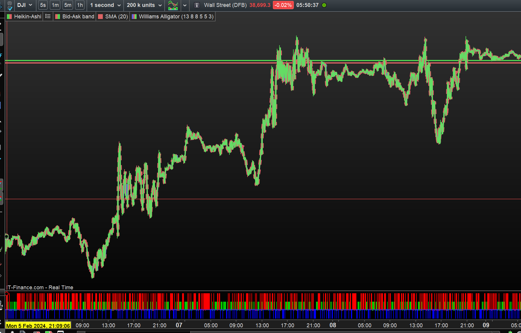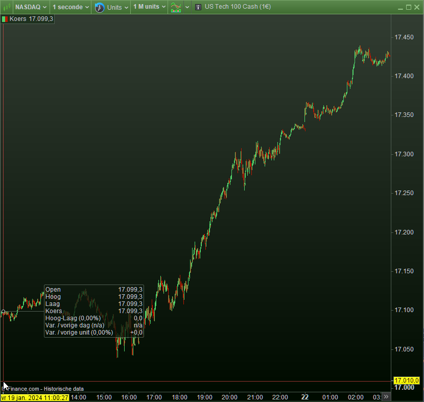 In your image I think I can glimpse a scroll bar along the bottom, I think, if so, does that mean you have data going back a little further? If so, this is what I mean by being able to zoom out proper. I see something similar on ASX and also DJIA, as I think you might be too. Does 200k units = viewing area? 200K units @ 1sec = ~2.2days ….. looking for rabbits down this hole atmo