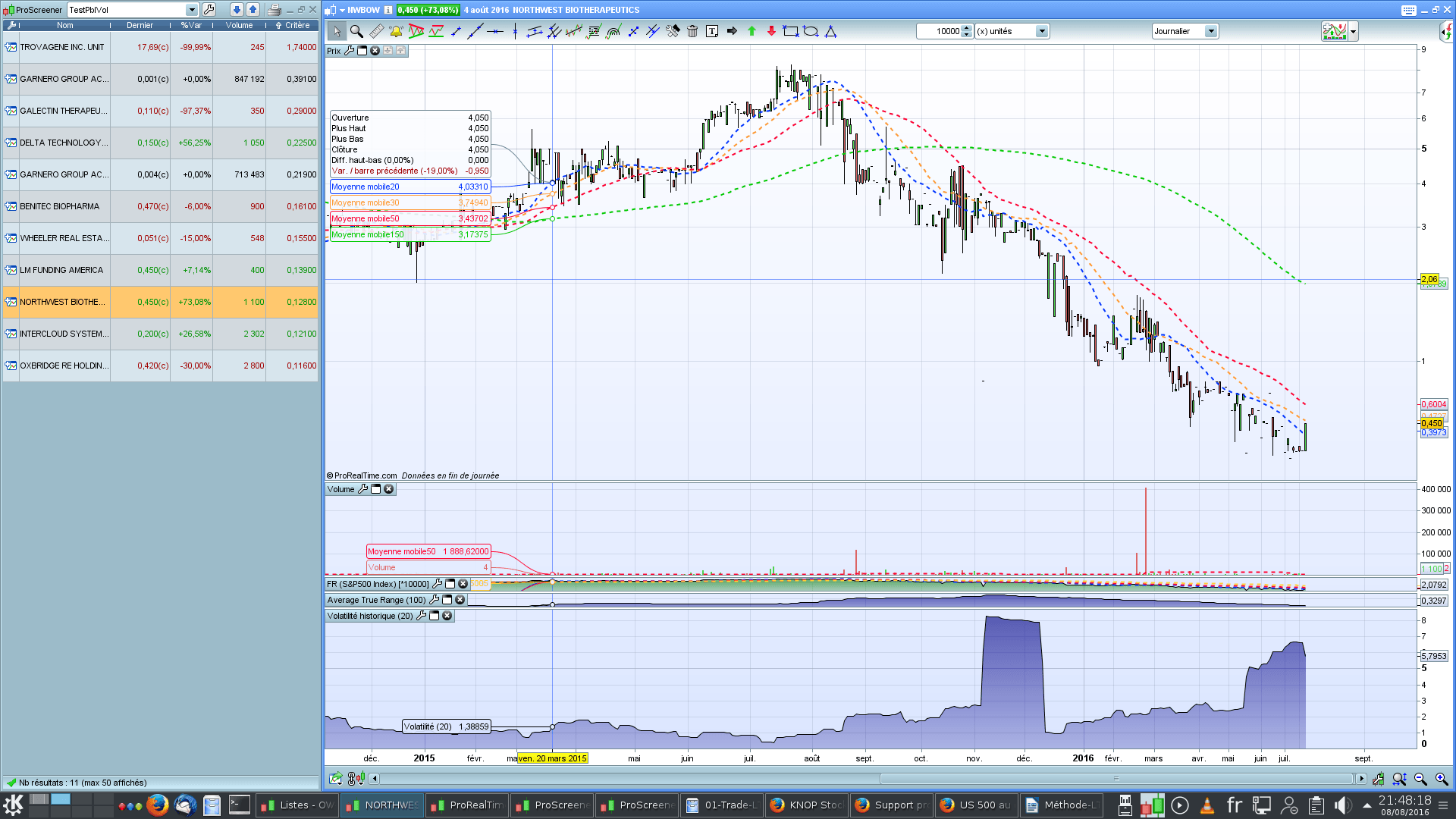 Je me sers assez peu des screeners, alors je vais peut-être dire une grosse bêtise, mais en regardant ton fichier attaché, et l’irrégularité de l’axe horizontal alors qu’on est en daily, il me semble que Northwest Boetherapeutics est une valeur assez peu liquide qui n’a pas forcément de transaction chaque jour? Du coup je me demande si la différence de volatilité historique entre le graphe et le screener ne viendrait pas de 2 façons différentes d’aborder les 20 dernières périodes: dans un cas il prendrait les 20 dernières fois où ça a coté (le graphe), dans l’autre cas (le screener) il prendrait les 20 derniers jours même s’il y a eu des jours sans transaction? Et donc ça donnerait 2 résultats différents (je précise que je dis ça vite fait, je n’ai pas essayé de faire les 2 calculs différents à la main pour vérifier). Je pense qu’il serait intéressant de tester si le problème ne se produit “que” pour des valeurs qui ont des jours sans transaction parmi les 20 derniers jours…