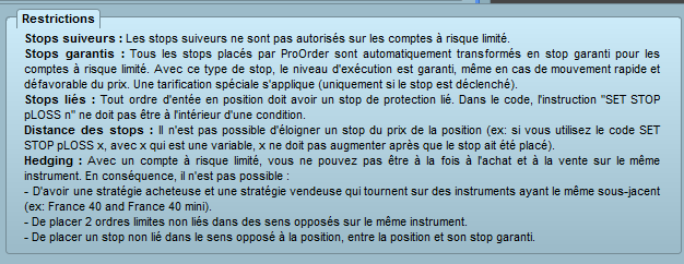 Indeed thank you, i only added this instruction SET STOP PLOSS 100 at the end and my code is online. But a warning (cf. attached snapshot) tells me trailing stop are not allowed with risk limited contracts. Impossible to simulate with the proback test which gives me the same result with and without the final instruction SET STOP PLOSS 100. Only live could give me the answer… I push it live.