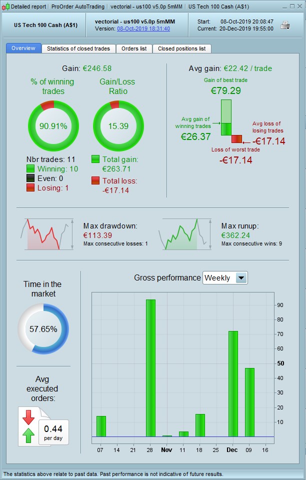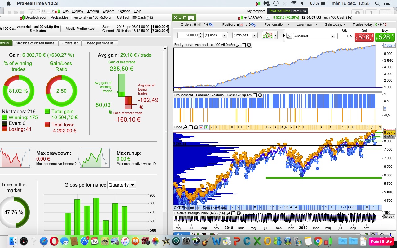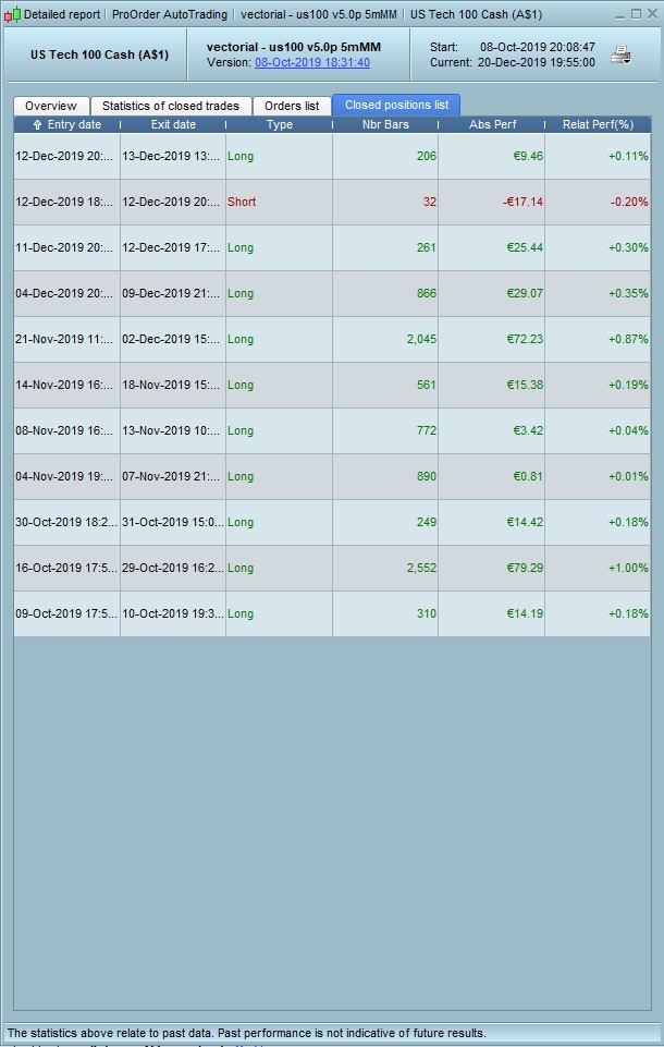 Good afternoon, I update the evolution of the strategy in the Nasdaq, it is working in real account, I am waiting for it to do 2 bad operations to increase a position, but it does not fail, I only carry a losing operation. Regarding the results of Strategy 6.1 on the Dax in November, I think it was an accident, a robot that has been making good numbers in a period of 32 months that is what gives the backtest does not stop working at night In the morning, I understand that if the market changes, it should progressively have worse results, but not always start losing. This month of December is in positive and the last operations are very good …. Good weekend and Merry Christmas!