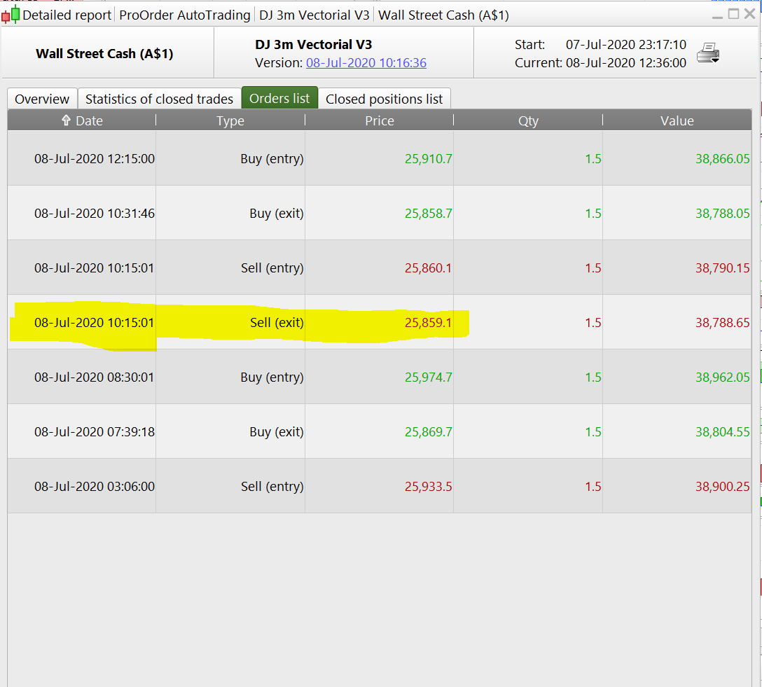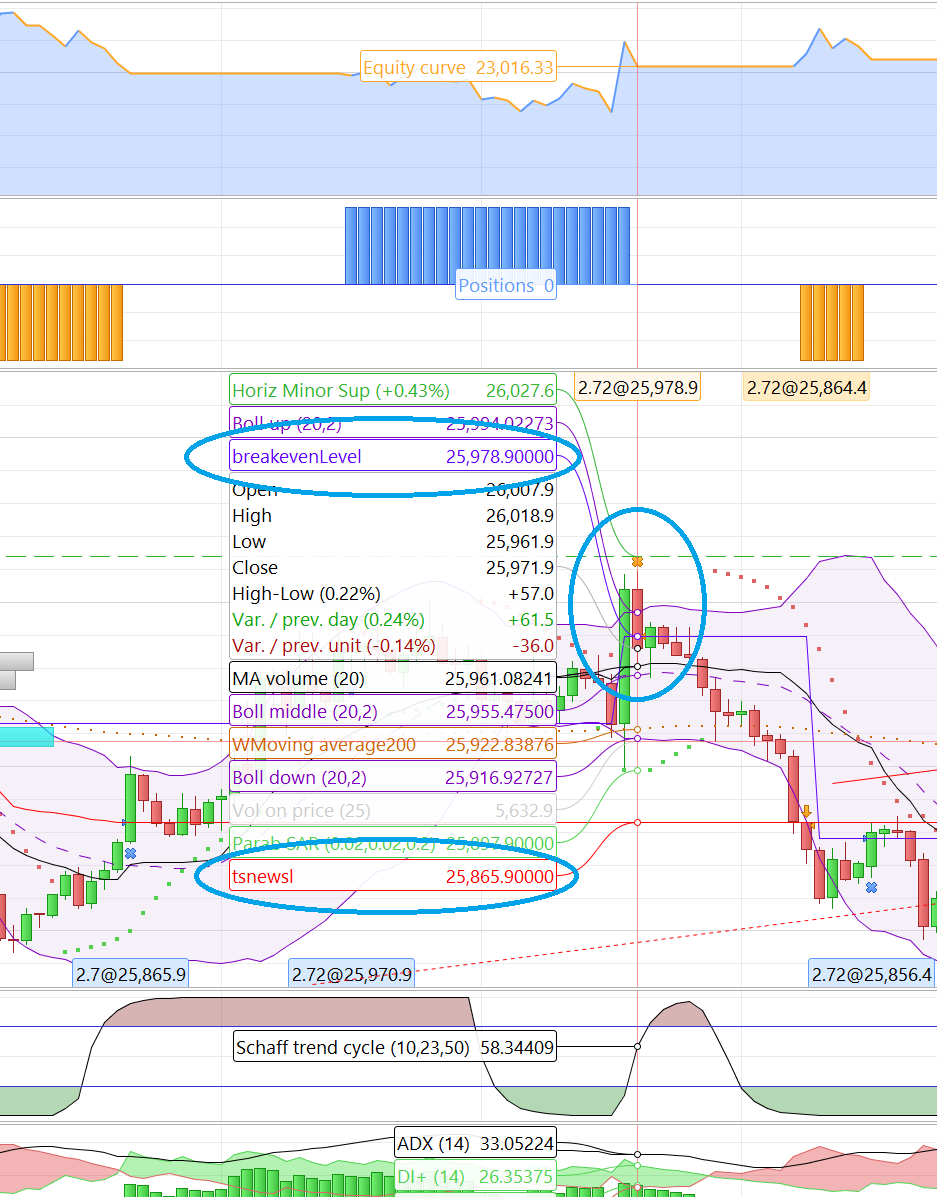 Meanwhile – watching the indicator (with the same code as the job) on DJI 3m TF – there seems be an inconsistency between the performance of the AutoTrading job and what the indicator shows. Specifically – closing down the long position, which unlike the job’s action, should have been closed much closer to the reverse point of the market according to the indicator. (at 25,971.9 on 9:36 P.M.)