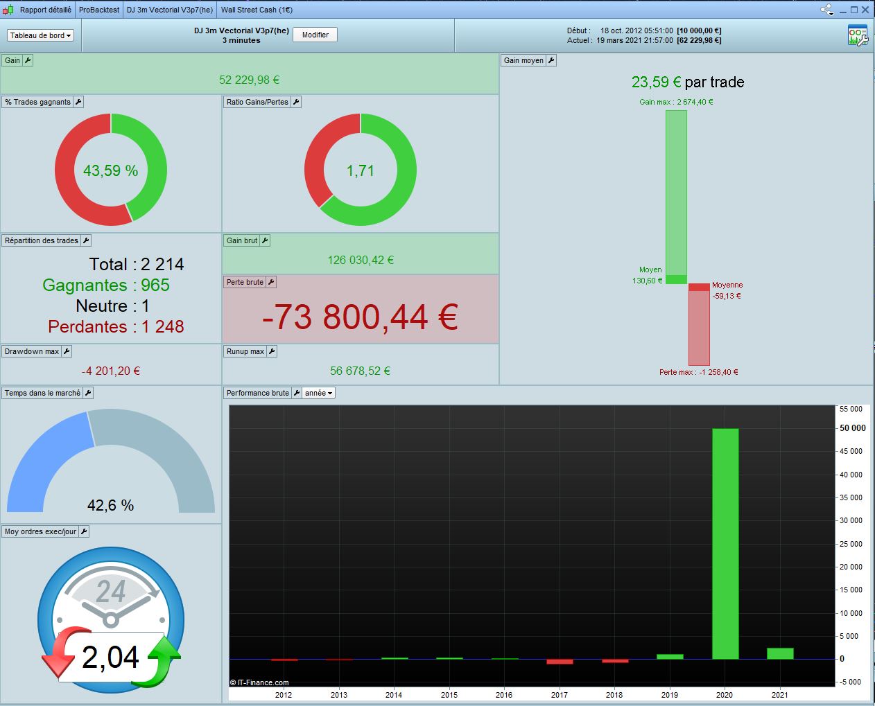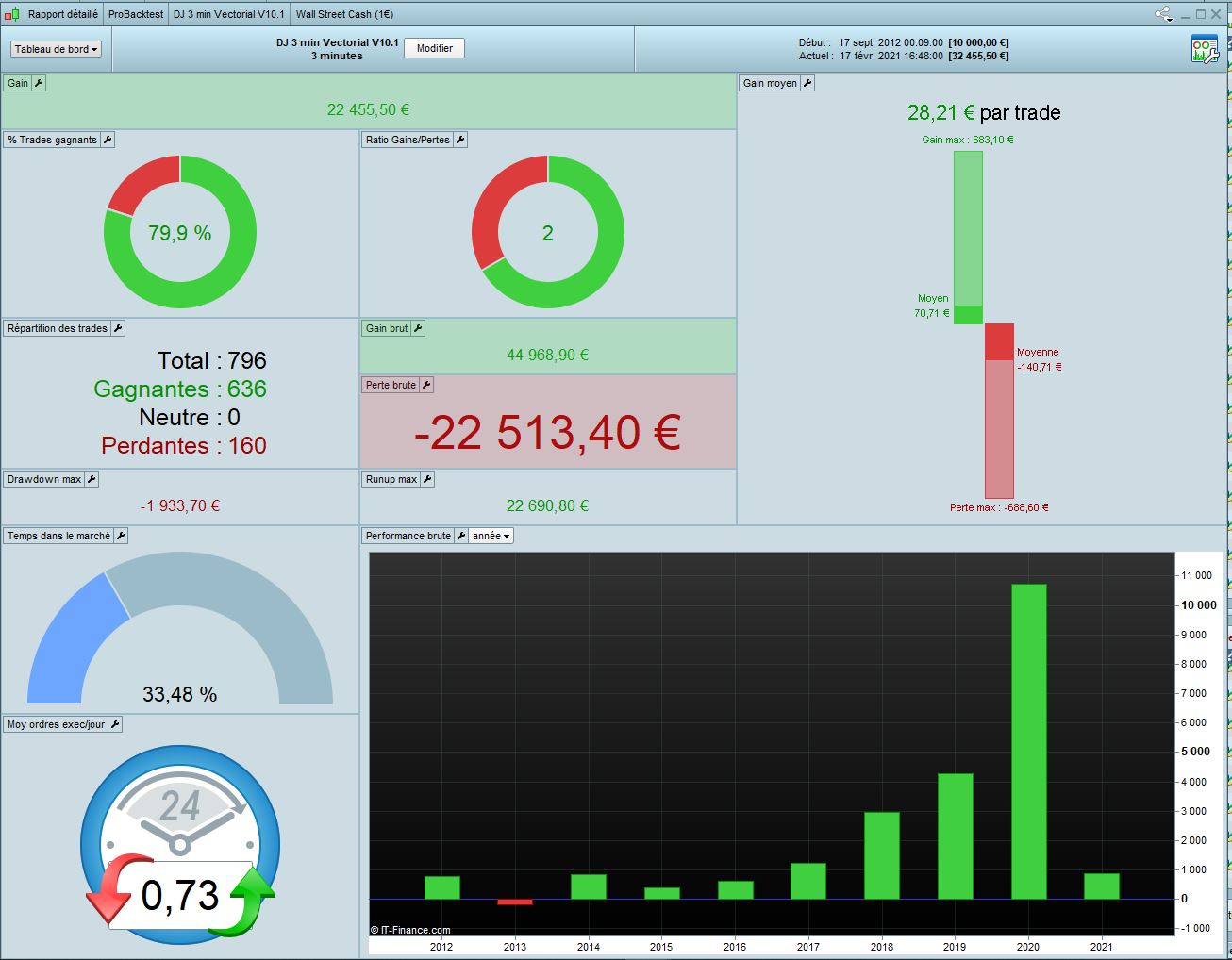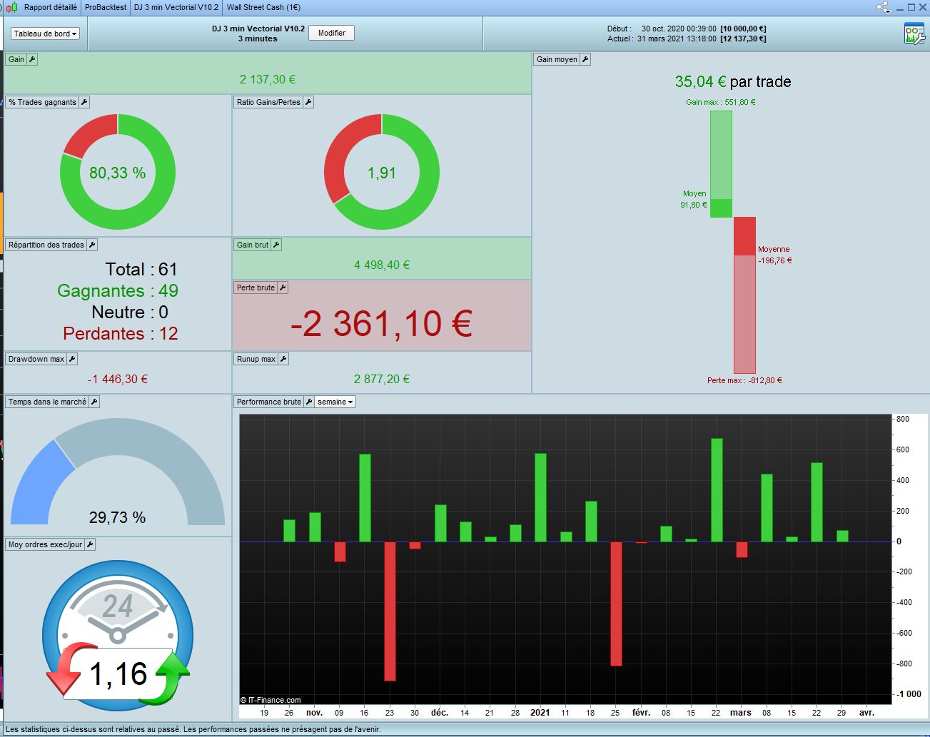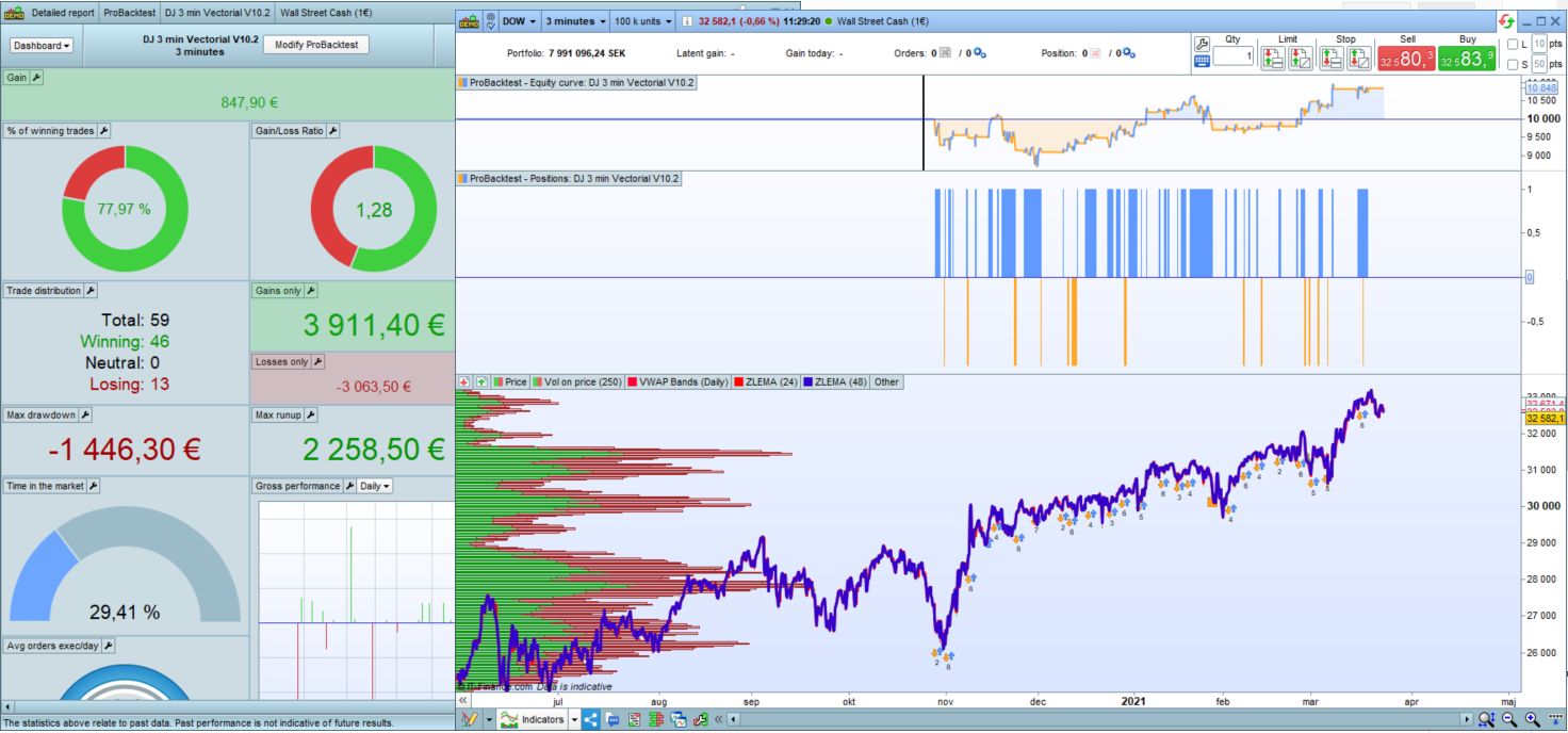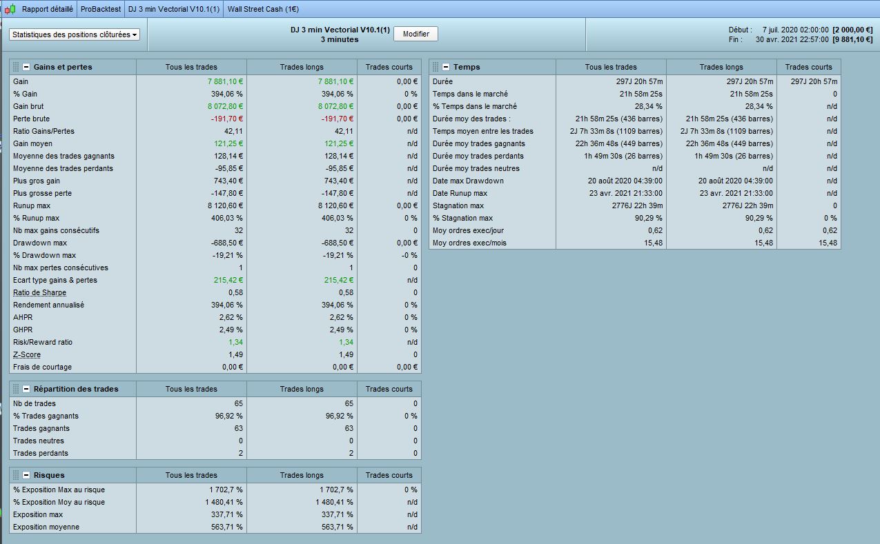 I worked on DJ 3min Vectorial V10.1 from Tanou and optimized all variables in 100k in Long only. I call this code V11. Results looks good with the form of market we have since Covid. Of course it’s interesting if it’s accept that market change with 2020 crisis.