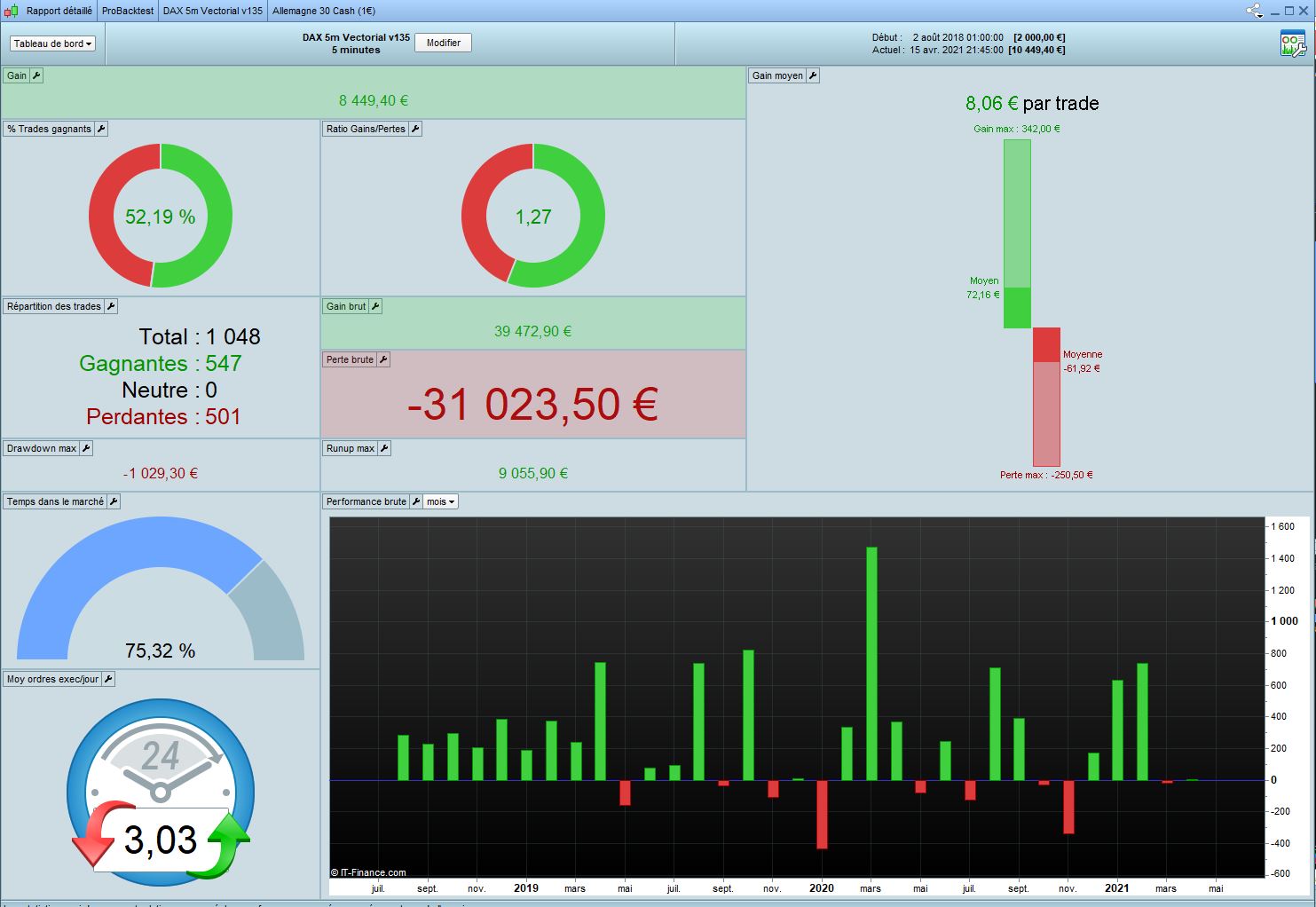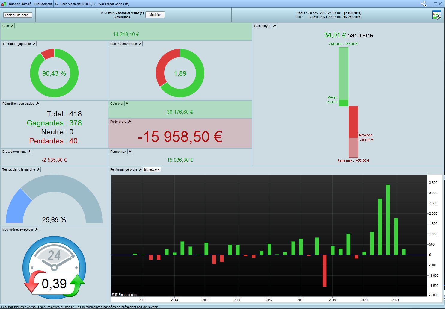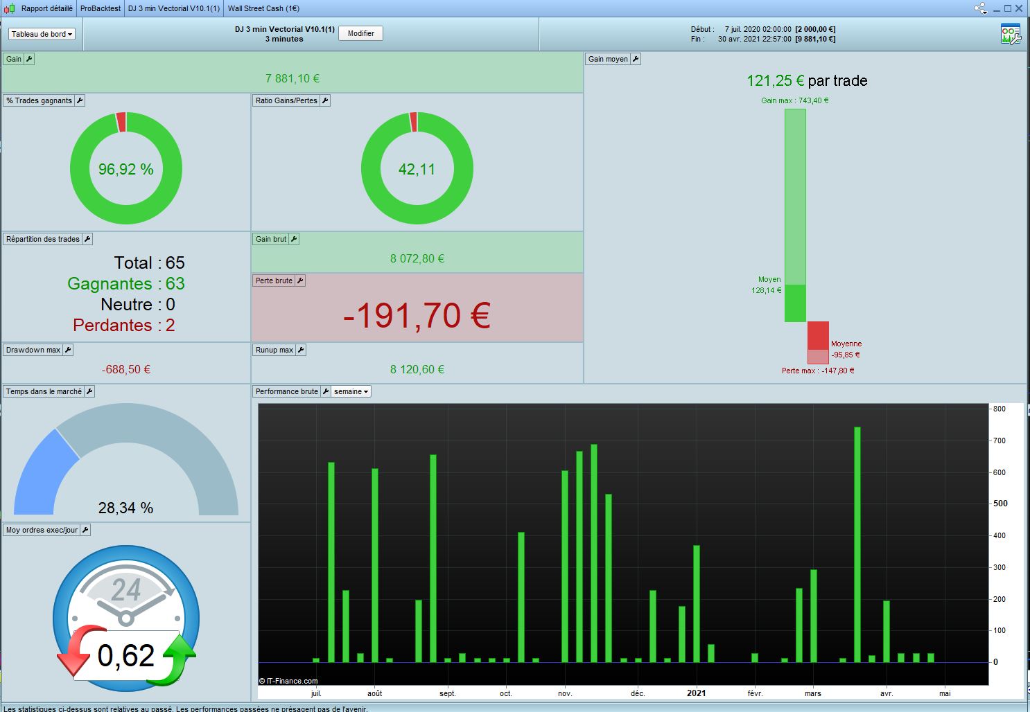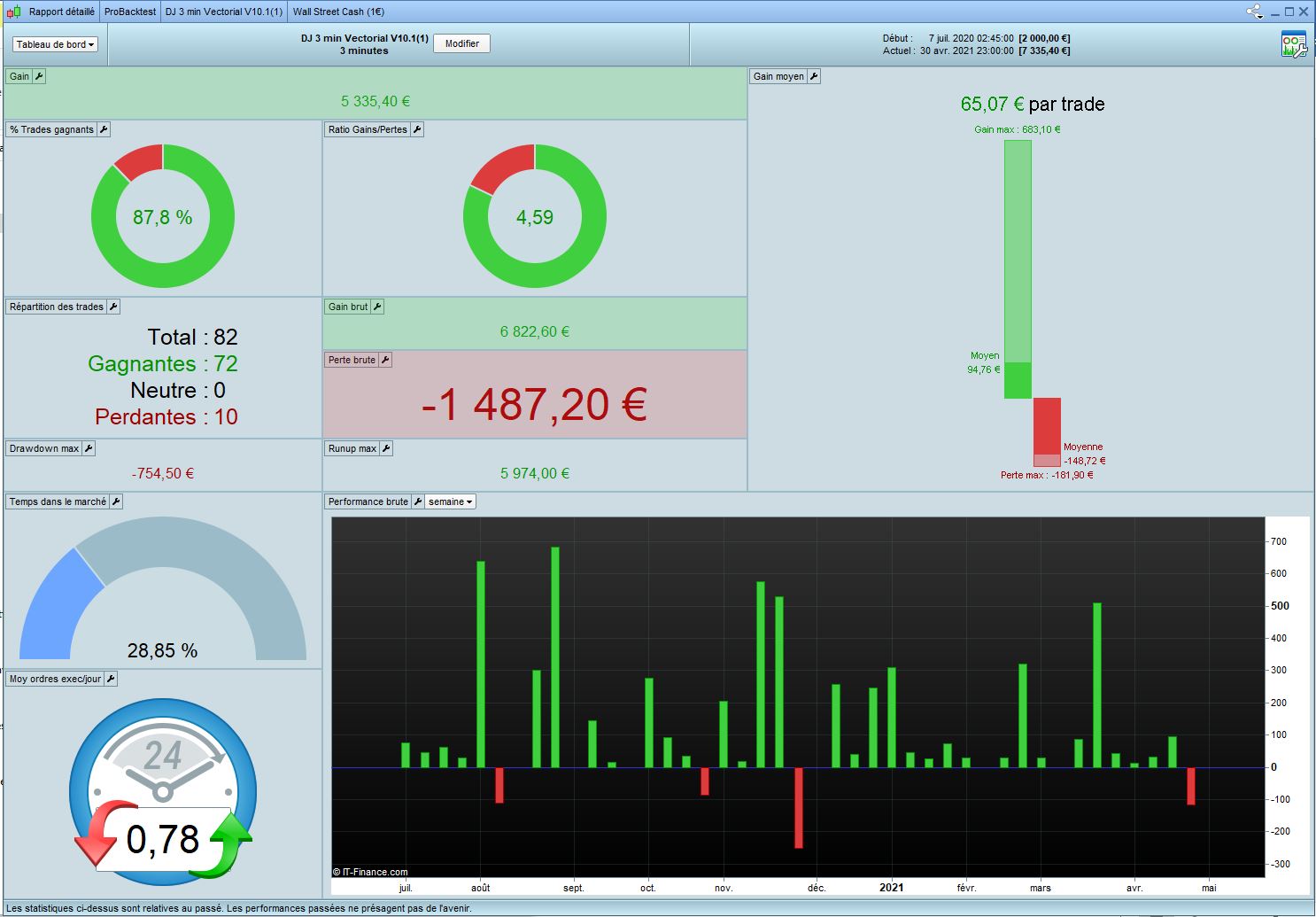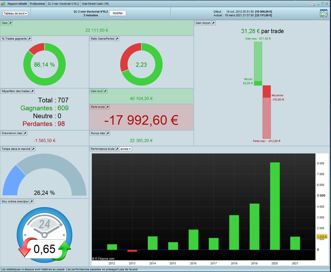 I worked on DJ 3min Vectorial V10.1 from Tanou and optimized all variables in 100k in Long only. I call this code V11. Results looks good with the form of market we have since Covid. Of course it’s interesting if it’s accept that market change with 2020 crisis.