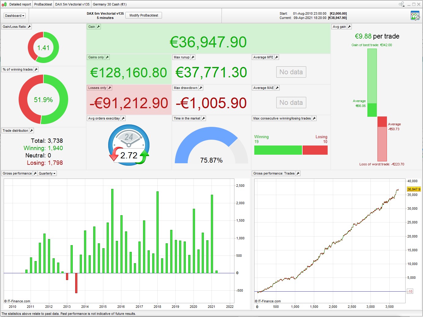 We also can see that we are in market long time (75%) and long and short are very equal ni results (P/R 1.27 for both)