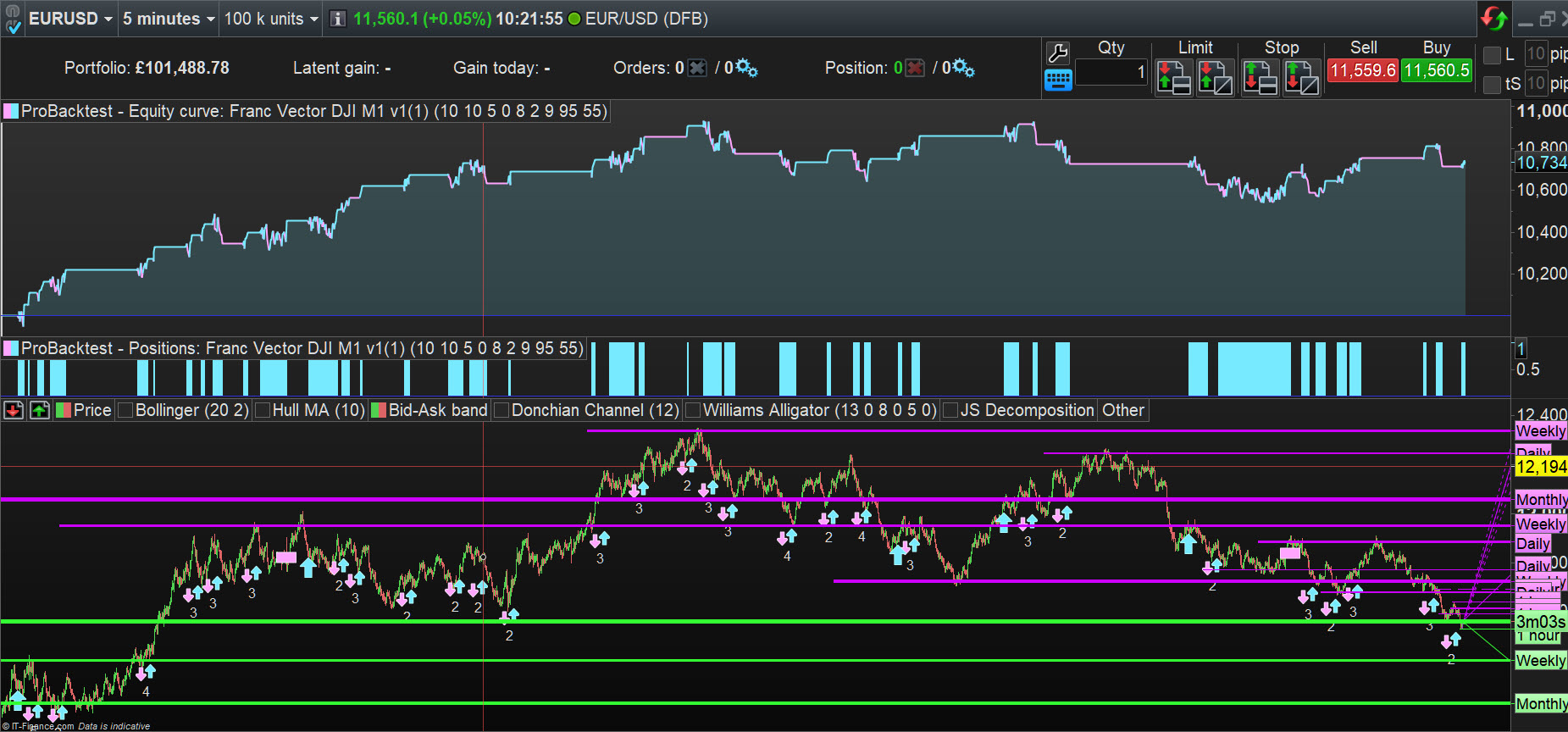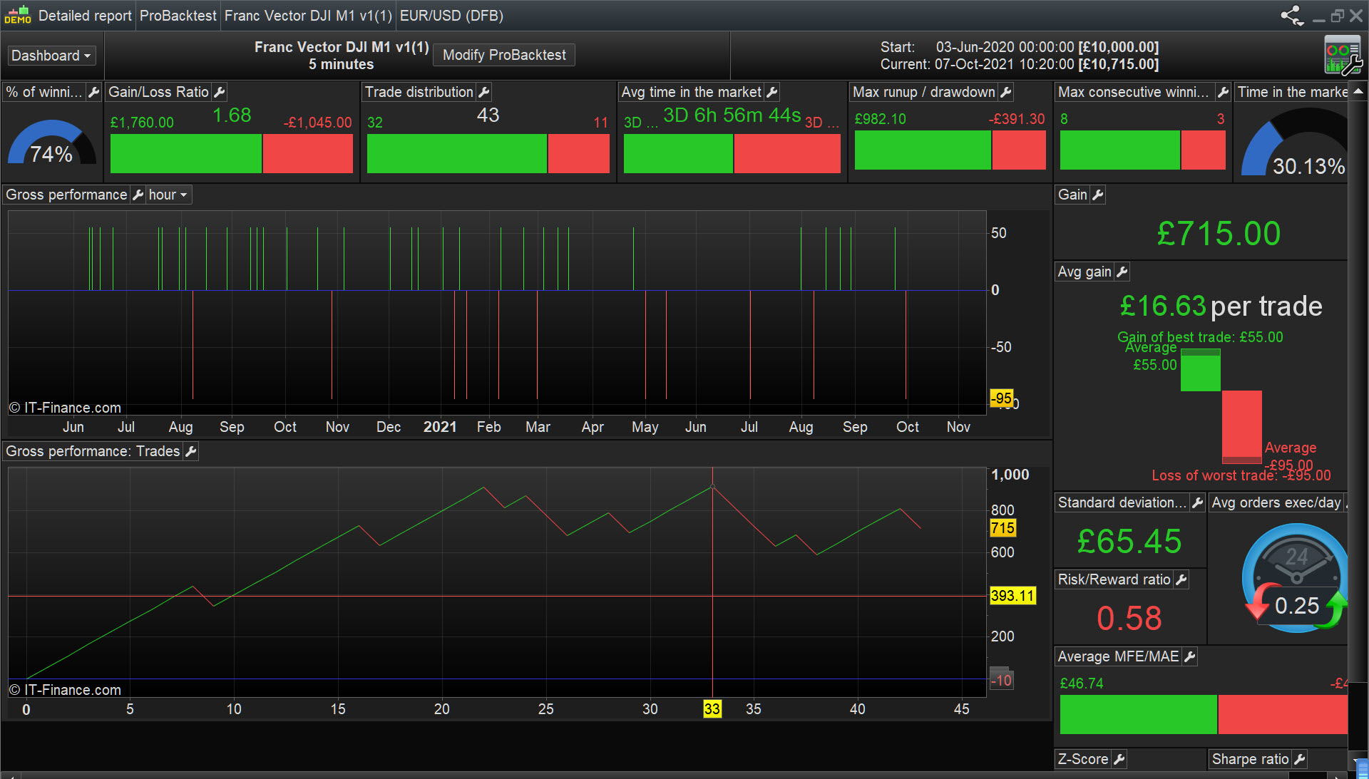 Attached results for 100k bars on EURUSD on 5 min TF, 43 trades, average gain £16.63 per trade, spread = 2.