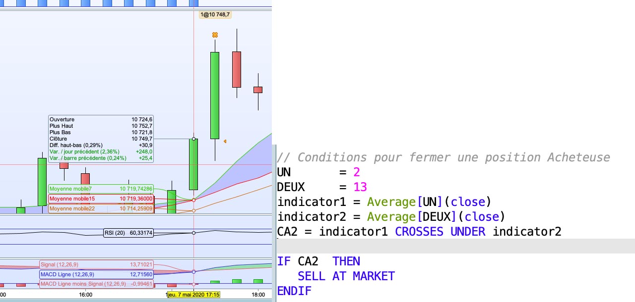 Normalement la position acheteuse est clôturée lorsque la MM7 croise à la baisse la MM15 dans mon test.