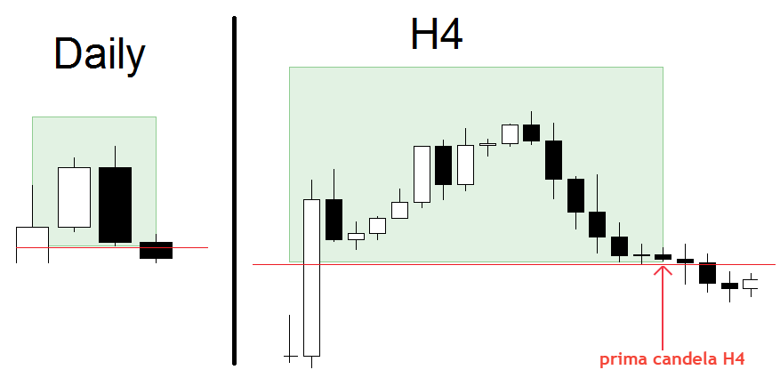 - A questo punto devo verificare se la prima candela H4 del giorno successivo chiude sotto il minimo del giorno prima