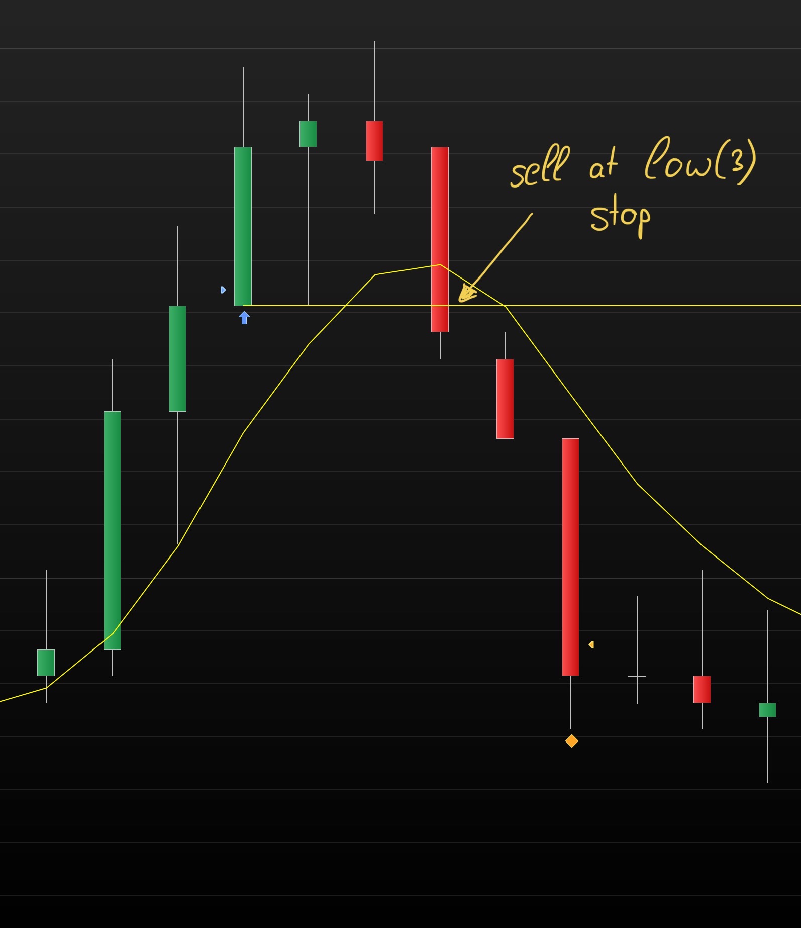 Es muss das Minimum der dritt vorangegangenen Kerze (low[3]) sein.