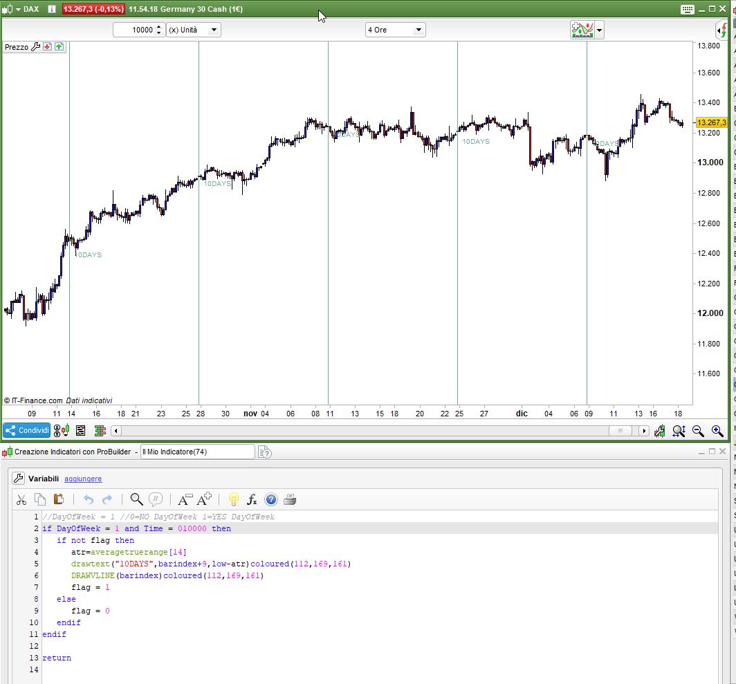 I have managed to code a vertical line to be appear in every 5days.. but is there a way to make this appear in every 10 days. also on the code the 10 DAYS text to be on top or the bottom of the chart. any help would be much appreciated!