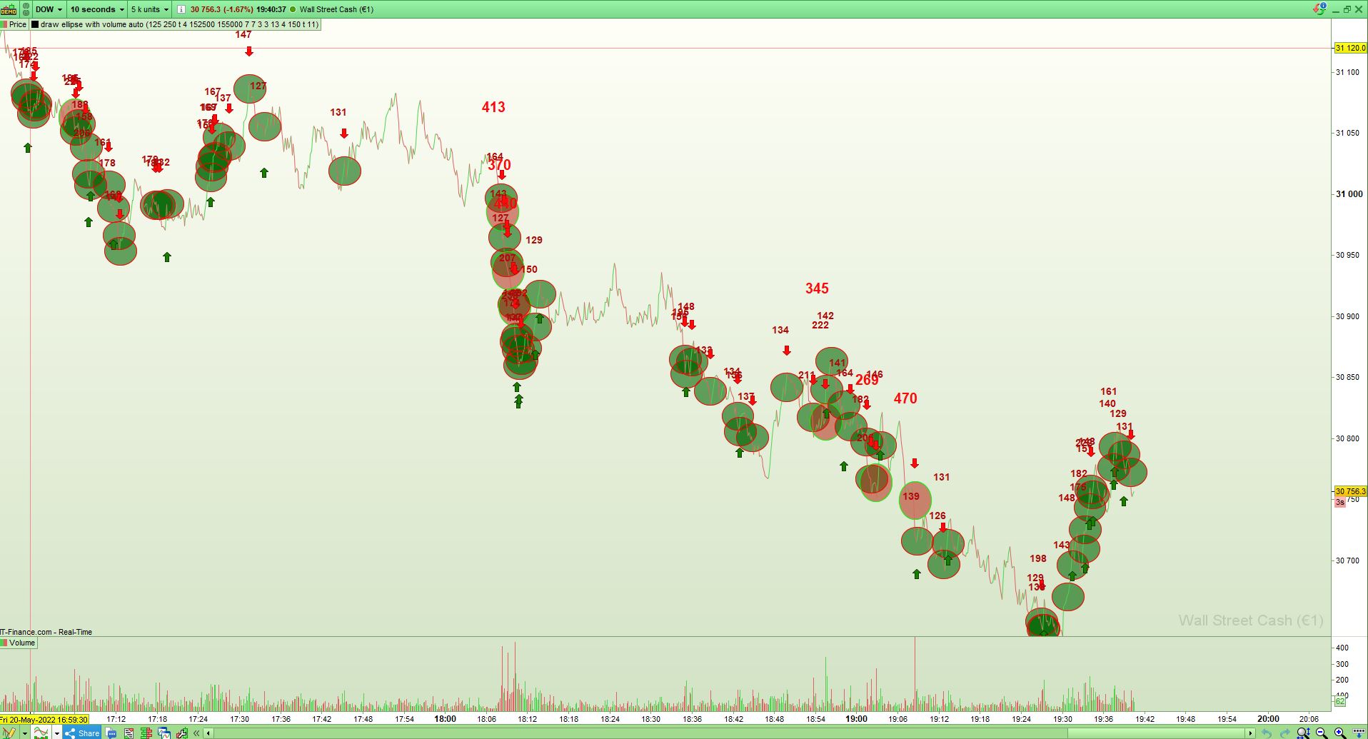 I am a day trader, trade manual based on volume profiles, reversal zones and breakouts. A indicator I made is a code to plot volume bubbles on the graph, it is something similar that bookmap is offering in their program. I made a simplification of plotting volume in the shape of bubbles or ellipse on the chart. The volume can be adjusted in the variables, so can the size and the volume number, that is also placed in the chart.