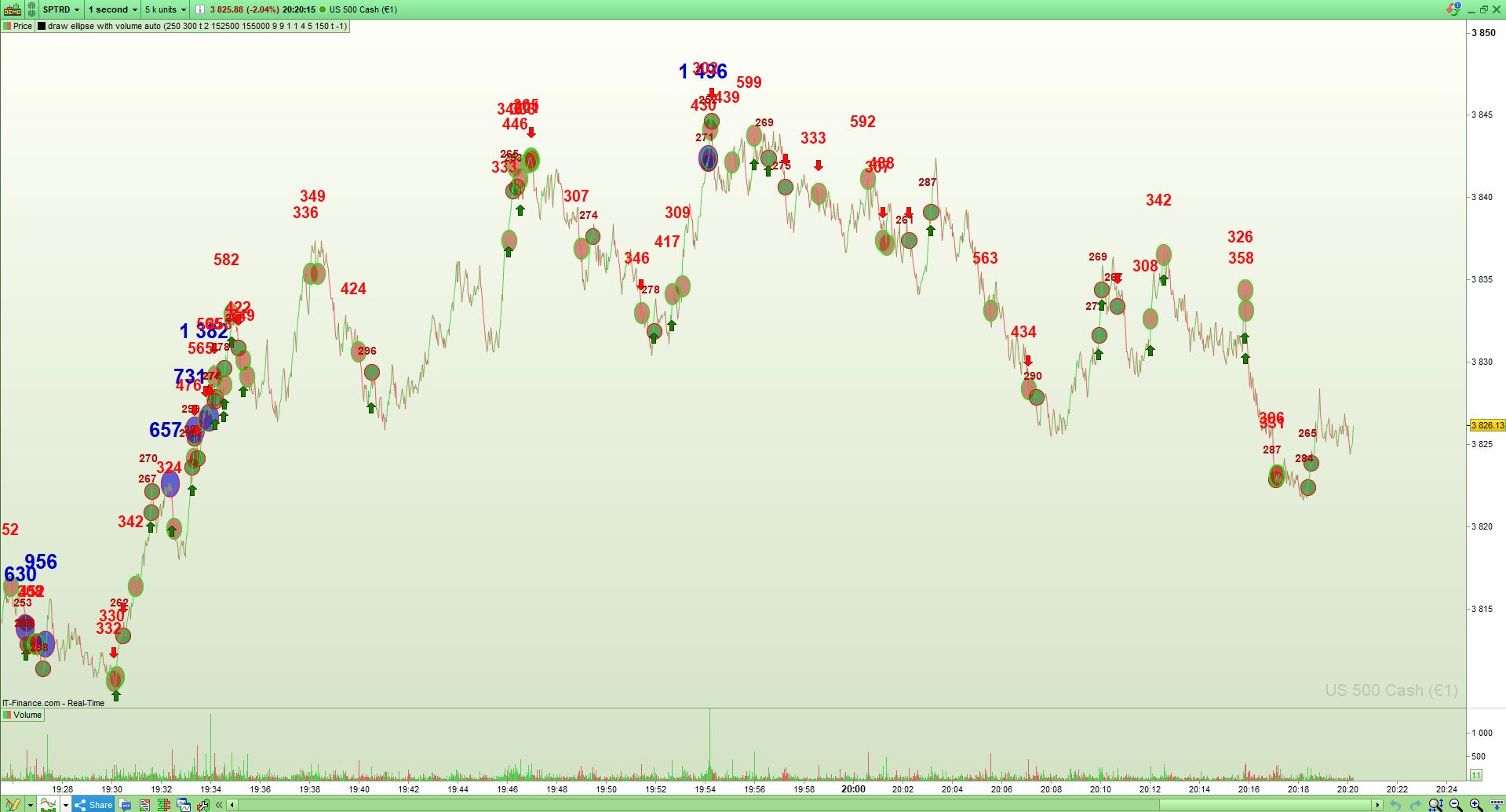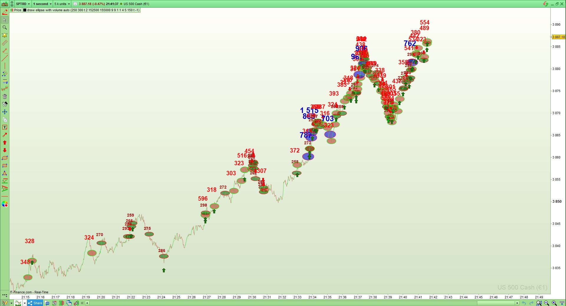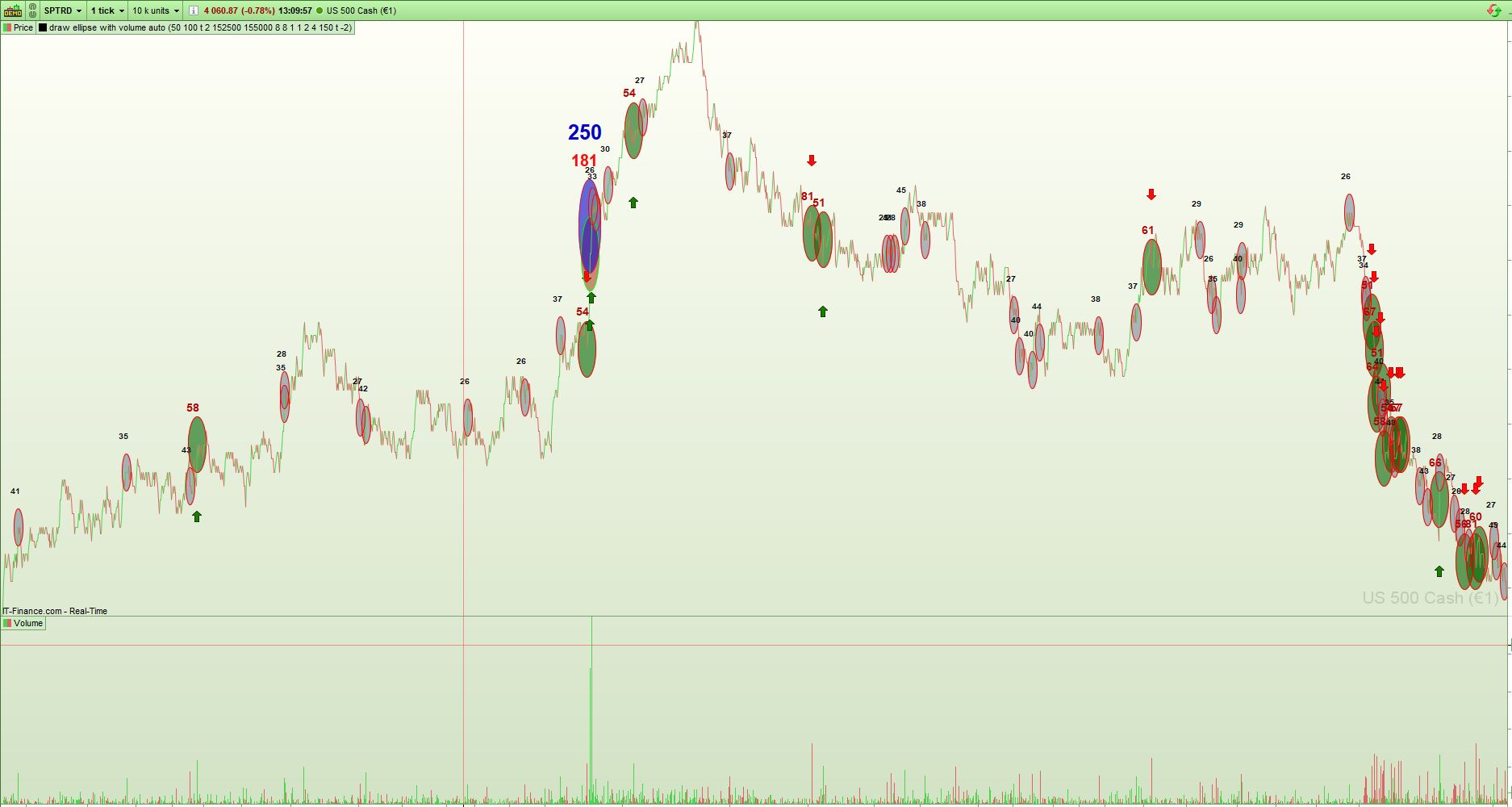the indicator shows you where big volume in the 1 second chart (you can try also higher or lower timeframes) is taking place. you can see stopruns, or where big volume is traded (maybe the big blue bubble/numbers are the big traders/institutional or, so called icebergs, traded at important key areas).