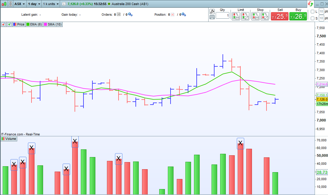 Below I have taken a screenshot – all the volume bars marked ‘X’ can be any other color of your choosing to highlight them. These bars have higher volume than the previous session and have a equal or greater loss than -0.2% in the session. Sorry to waste your time!