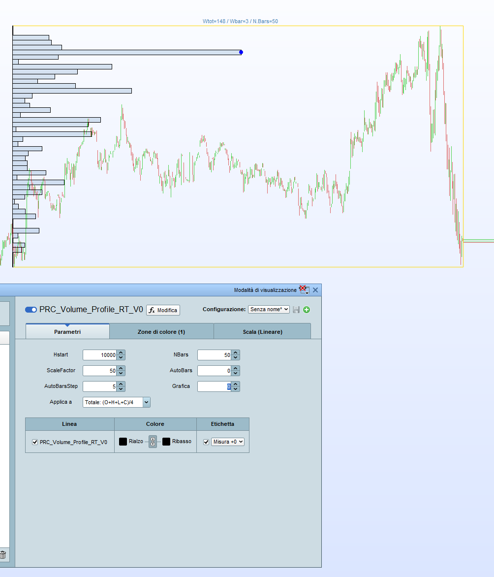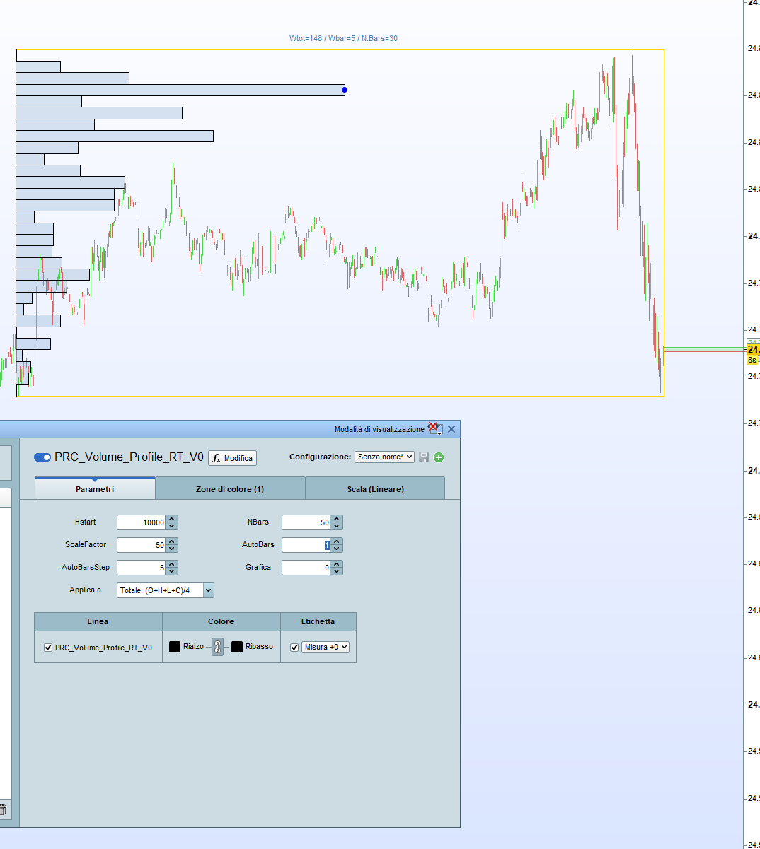 Salve, per chi può essere interessato, ho scritto questo codice per il Volume Profile con qualche opzione supplementare rispetto a quello standard di Prorealtime (che non fornisce le variabili che calcola internamente):