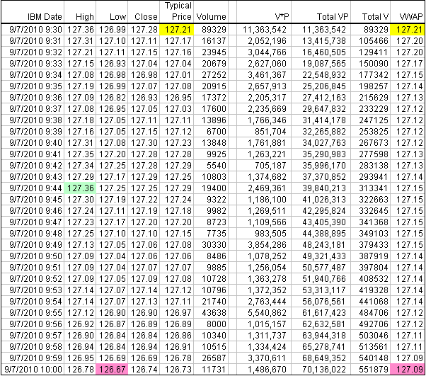 There are five steps involved in the VWAP calculation. First, compute the typical price for the intraday period. This is the average of the high, low and close {(H+L+C)/3)}. Second, multiply the typical price by the period’s volume. Third, create a running total of these values. This is also known as a cumulative total. Fourth, create a running total of volume (cumulative volume). Fifth, divide the running total of price-volume by the running total of volume.