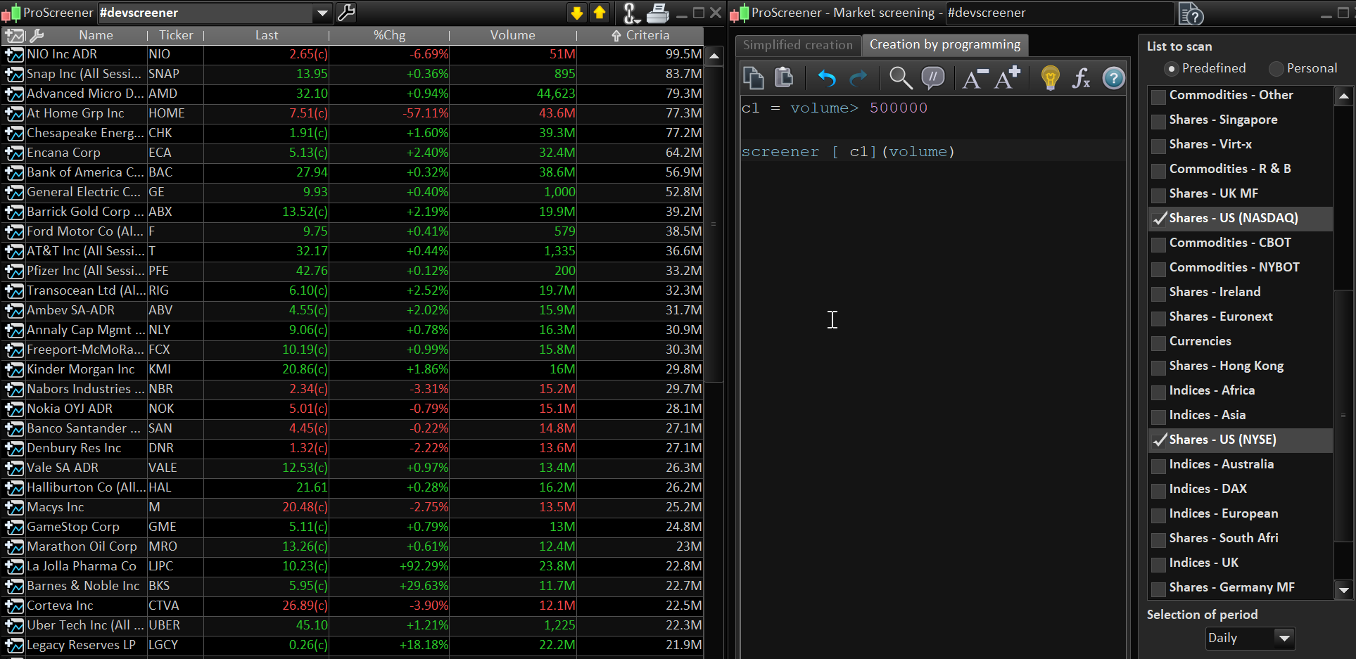Der folgende Code funktioniert ordnungsgemäß. Das Problem ist, dass die Spalte "Volume" im ProScreener-Fenster eine falsche Volume-Menge zurückgibt und ich nicht weiß, warum … weil, wenn Sie das Volume als Sortierkriterium im Code hinzufügen (wie ich es getan habe) ), sehen Sie, dass die Bedingung eingehalten wird. Ich werde PRT wegen der falschen Volumenmenge in ProScreener kontaktieren.