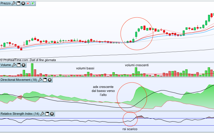 - directional movement (ADX) a 18 periodi crescente dal basso verso l’alto e minore di 20