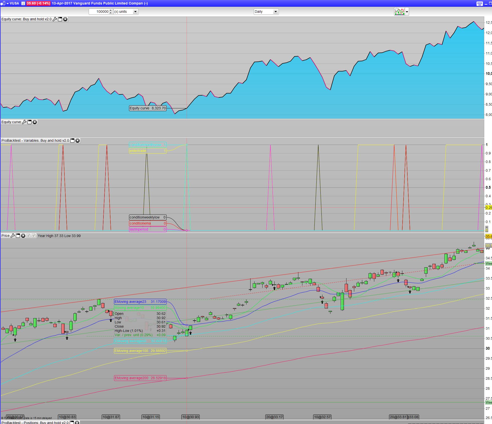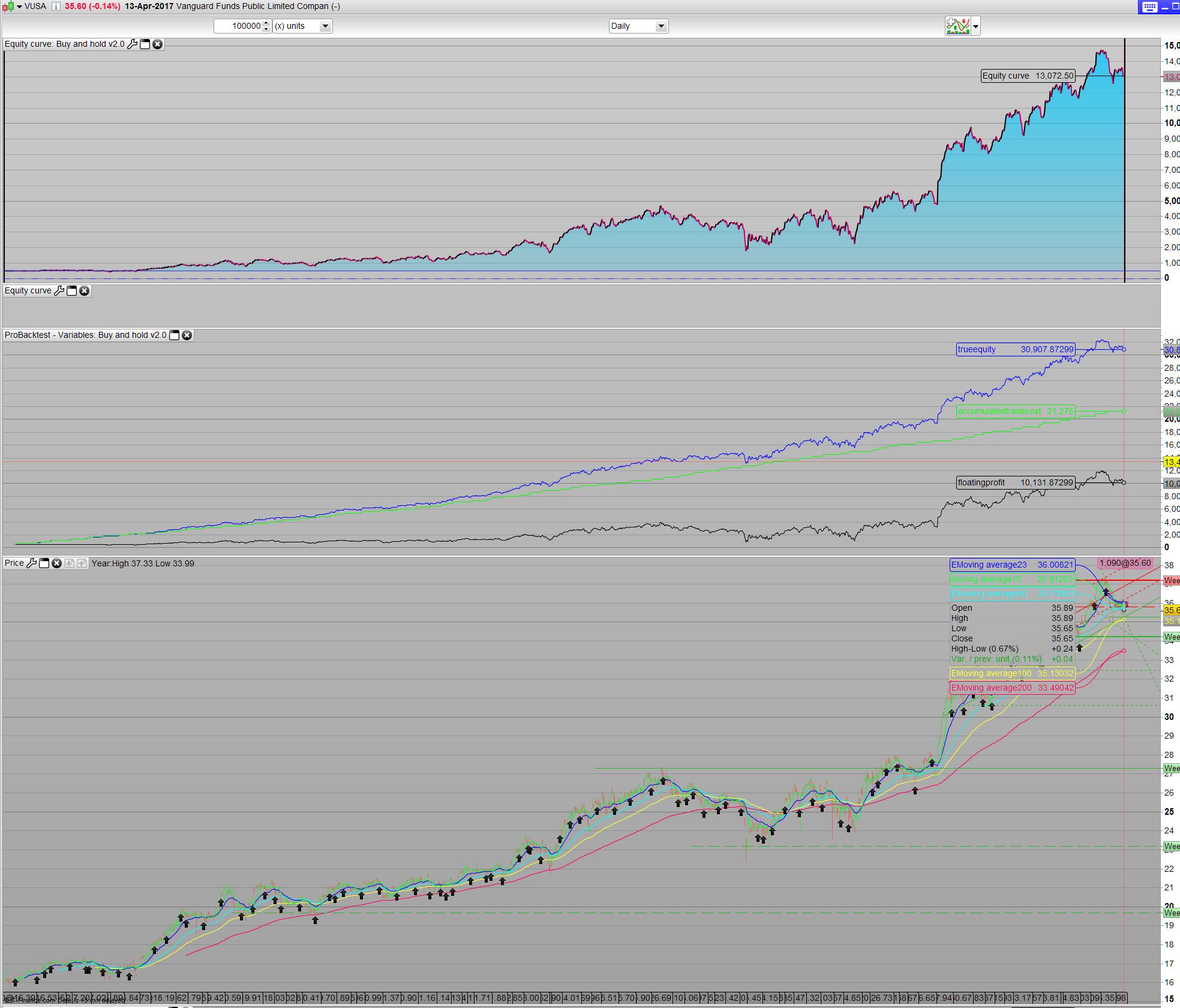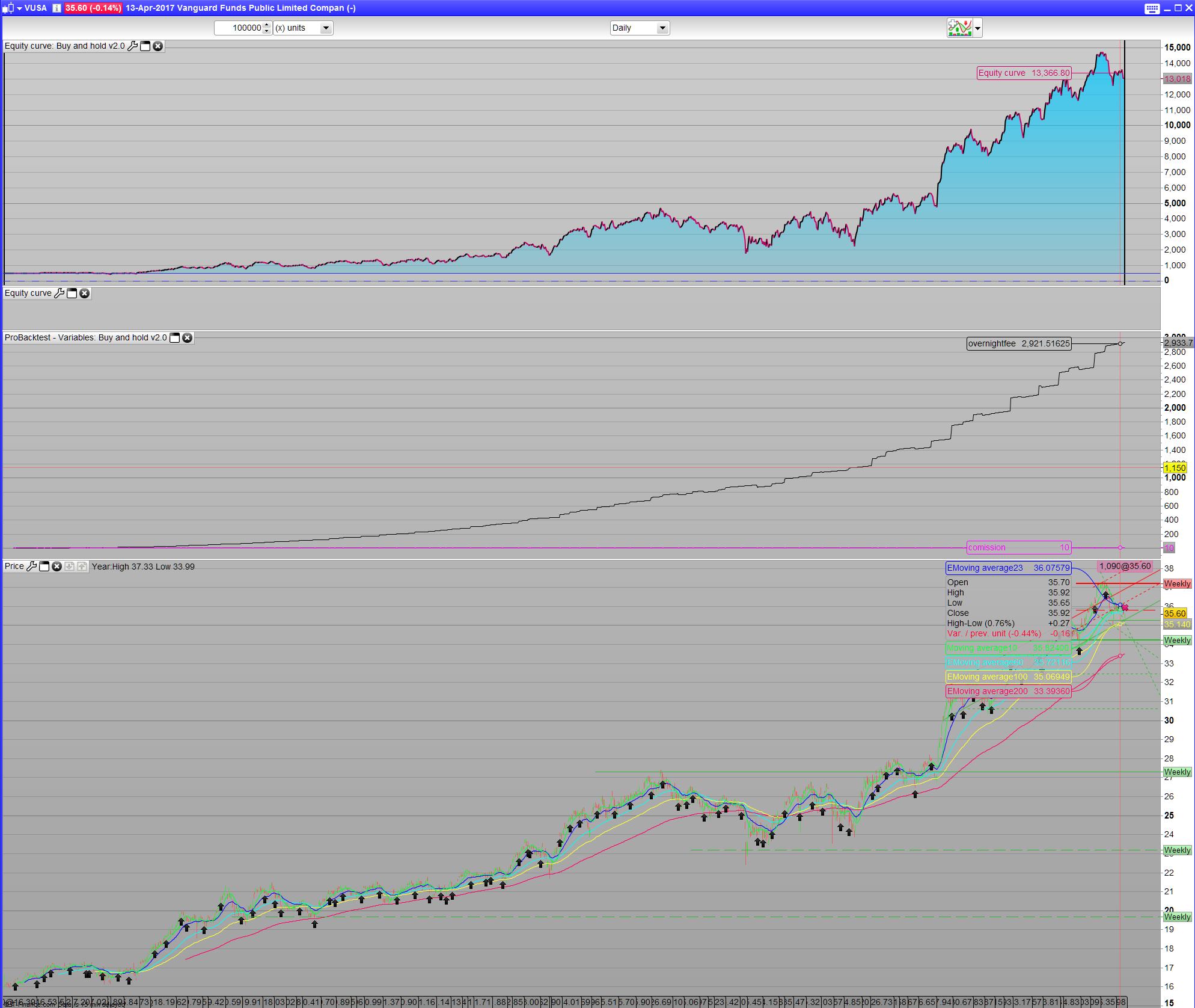 It took a couple of tries and emails from IG’s part to finally come up with the formular for my chosen Instrument- the Vanguard Funds Public Limited Companey – Vanguard S&P 500 UCITS ETF. For a positionsize of 5 it would yield (5 x 35.6425 x (2.5% + 0.25%))/365. This would give a total of £.0.0134 per evening. I rewrote the formula to overnightfee=(positionsize x tradeprice x 0.0275)/365. Comission is a ballance. The commission pr trade, charge is 0.10% of total tradeprice or $10, whichever is higher- so the code takes care of this, but around 290 positions is the ballance. It also dependant on the current price. However more or less 600 position buy a month is rather costly. We could take trades 4 time a year, so comission becomes insignicant. But for large account that can afford these trades it’s left as 2 trades a month. We will see that the comission is almost not important anyway. I make a total of 10 x 2 positions a month which is 20 euro a month in commision. In the end it’s a matter of choice of how much you spend to make money vs. How much you can afford save each month